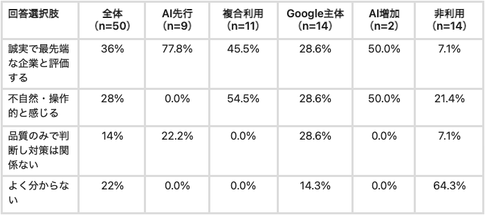 AI先行層(毎回AIから検索を始める層)の77.8%がLLMO対策を「誠実・最先端」と好意的に評価する一方、複合利用層では54.5%が「不自然・操作的」と拒否反応。同じAI利用者でも利用の深さによってLLMO対策への評価が完全に逆転しており、LLMO対策の「発信のしかた」が評価を決定的に分けます。