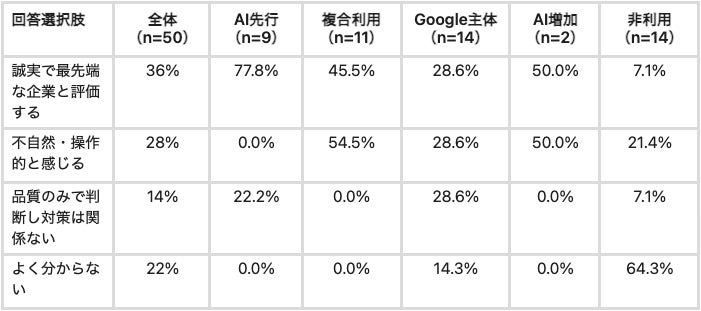 LLMO対策を実施している企業への評価について、AI先行層の77.8%が「誠実で最先端な企業」と好意的に評価した一方、複合利用層の54.5%は「不自然・操作的」と拒否反応を示すという正反対の結果が確認されました。同じAI利用者でも利用深度によって評価が完全に逆転することから、LLMO対策の「発信のしかた」がブランド評価を左右する重要な要素であることが示されています。