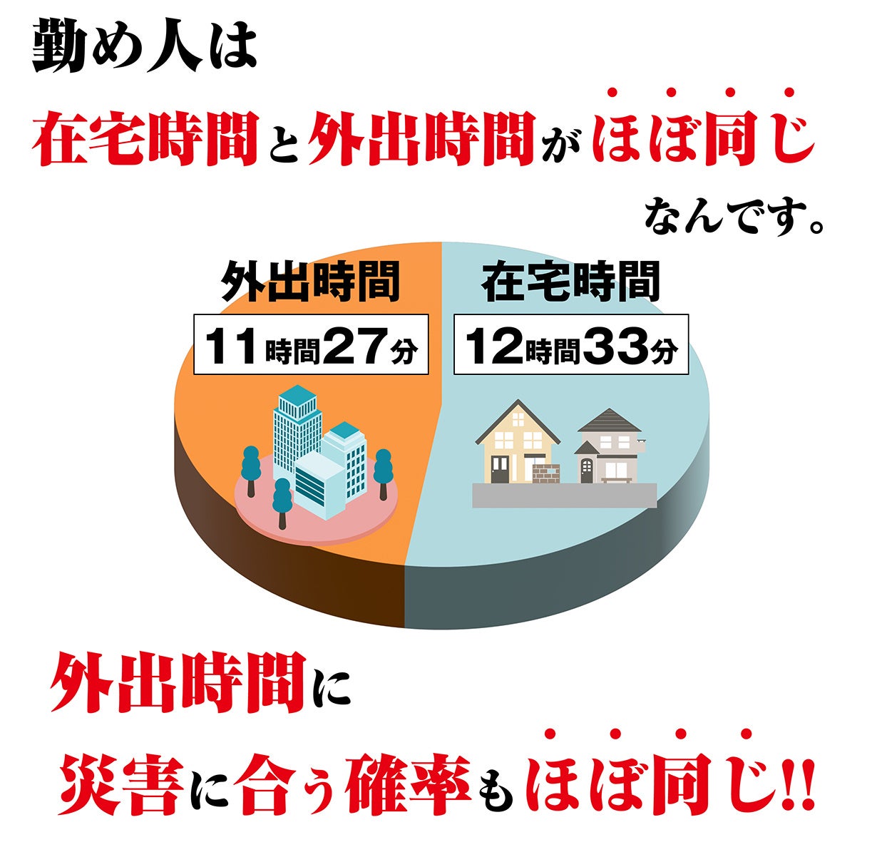 30年以内に巨大地震が起きる確率70%と言われている中で、自宅の防災用品を見直されたり、新たに防災用品を準備される方が増えてきています。しかし、勤め人は(平日)自宅で過ごす時間と外出時間が、ほぼ同じと言われています。