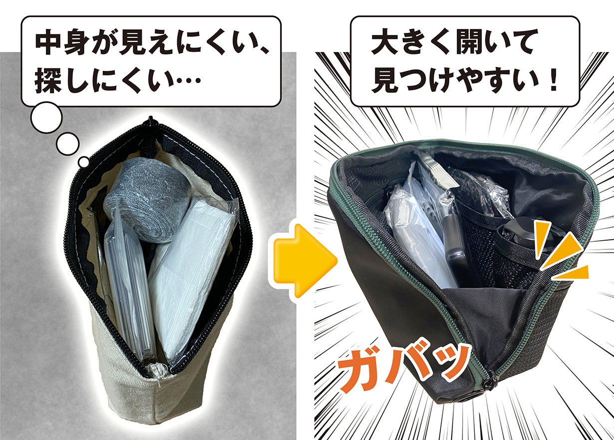 必要な物が『見つけやすい・取り出しやすい・持ち運びしやすい』ポーチで設計。