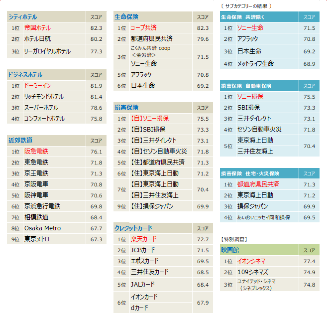 サービス産業生産性協議会はJCSI(日本版顧客満足度指数)第4回調査として、7業種(シティホテル、ビジネスホテル、近郊鉄道、生命保険、損害保険、クレジットカード、映画館)の顧客満足度を発表しました。