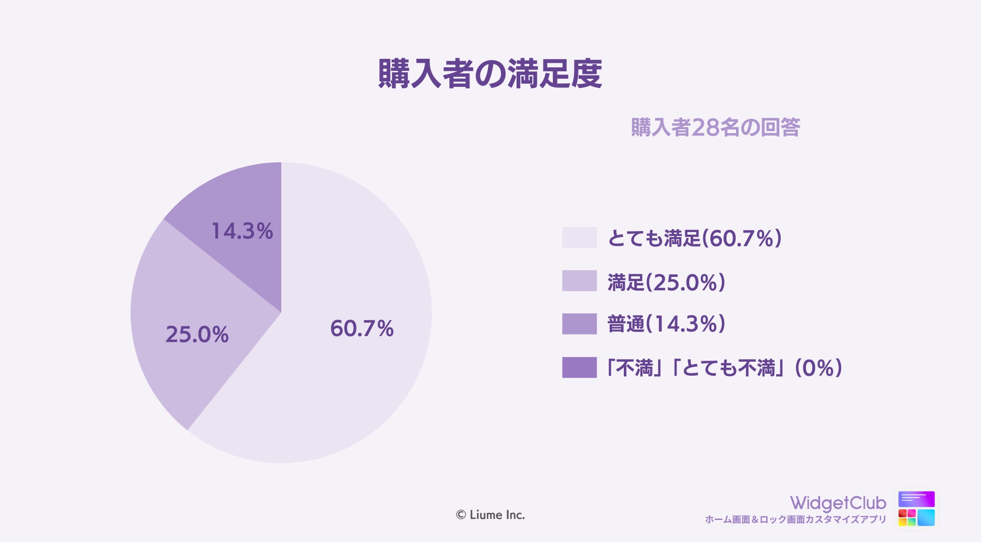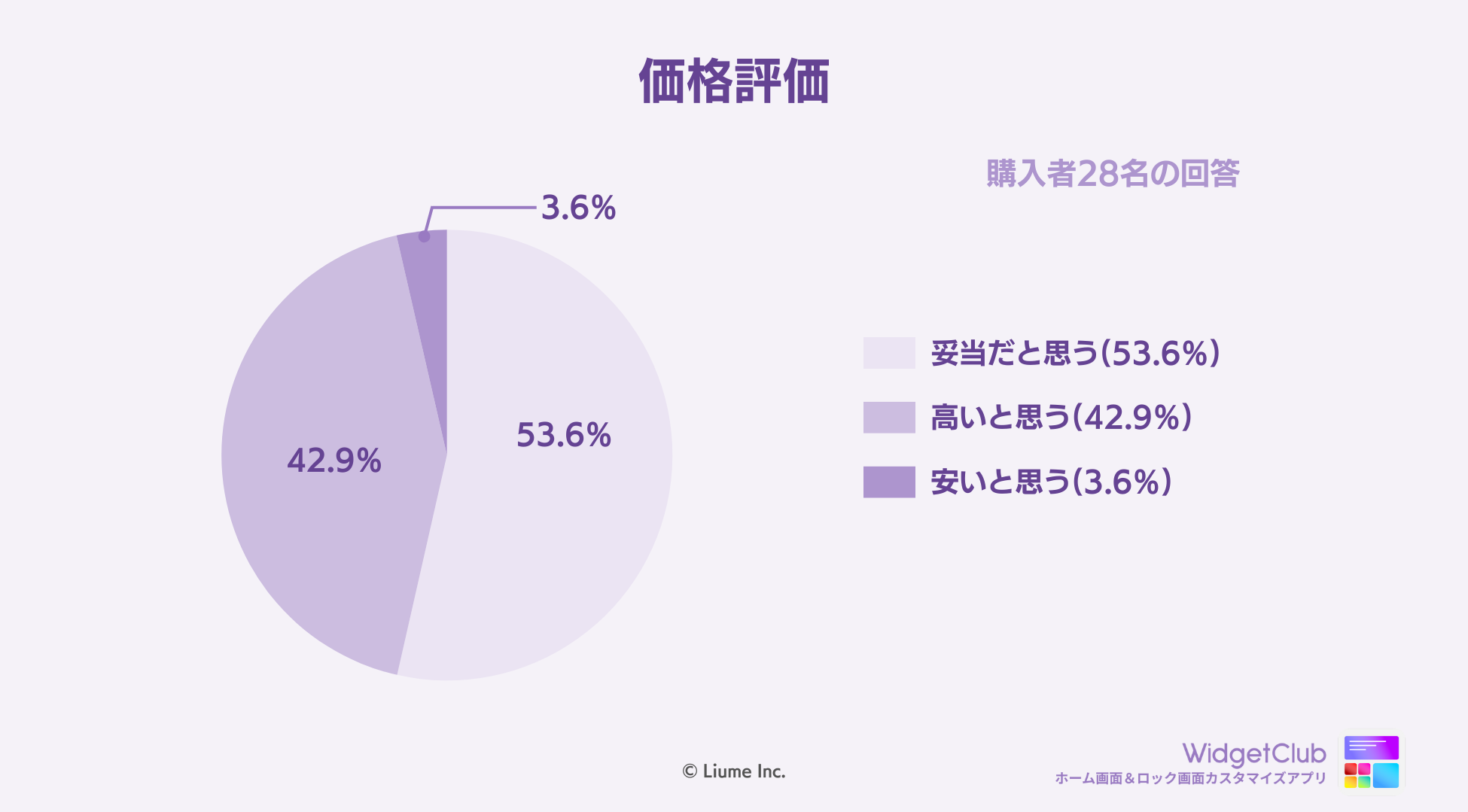 購入者の満足度は非常に高く、約85%が「満足以上」と回答しています。一方で、価格に関しては“妥当”が半数を超えつつも“高い”という厳しい声もあり、価格への感度は購入後も強いことが窺えます。