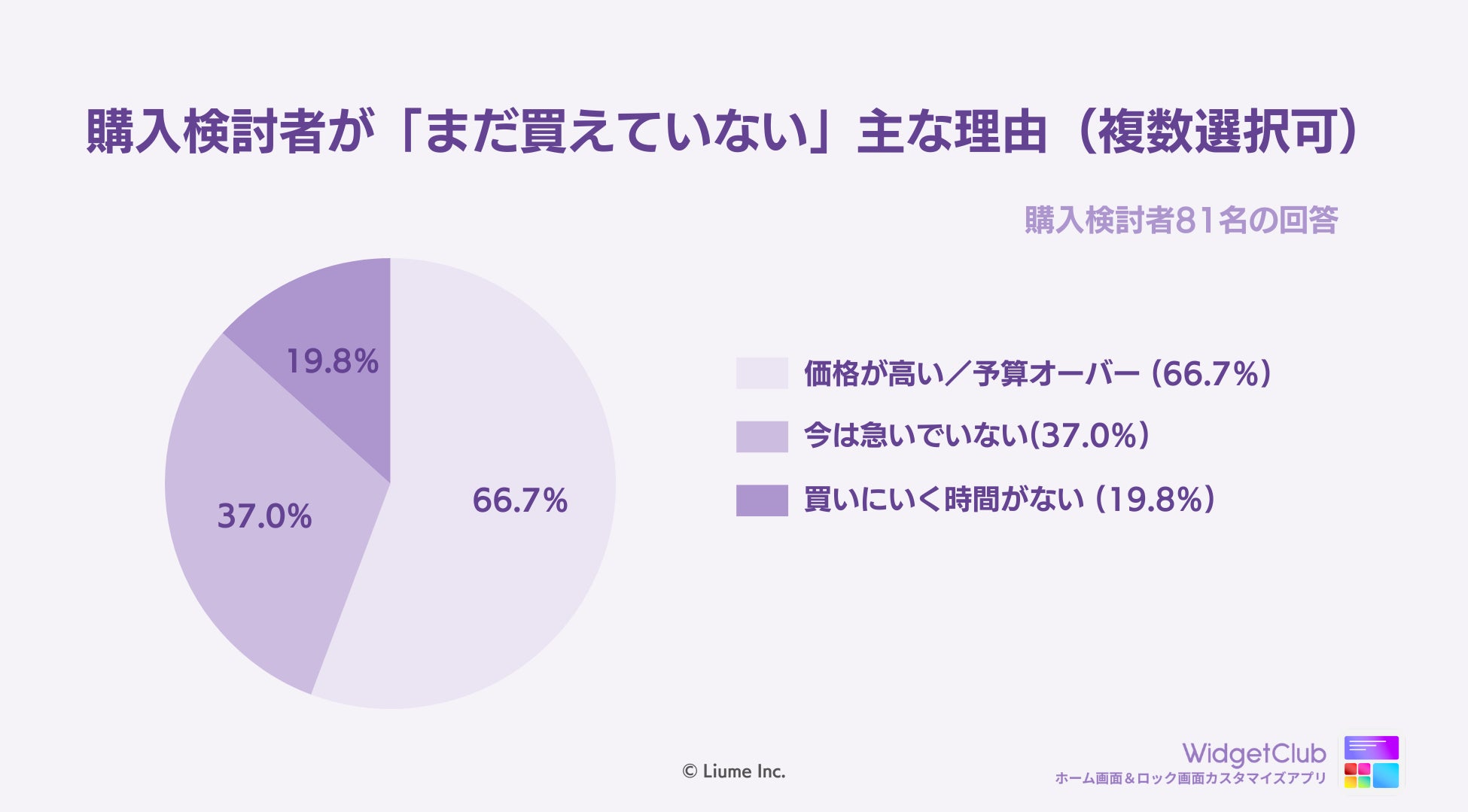購入検討者の約7割が「価格」を理由に挙げており、予算面でのハードルが最も大きいことが分かりました。また「今は急いでいない」という回答も37.0%と高く、買い替えの必要性が低いユーザーが多い傾向にあります。さらに「買いに行く時間がない」など、購入プロセスそのものの手間が障壁となっているケースも見られました。