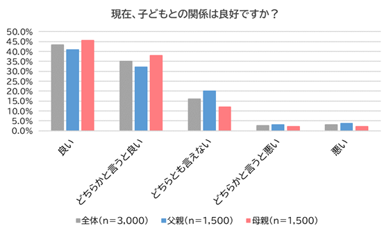 続いて、「現在の子どもとの関係」について尋ねたところ、8割弱が「良い」(全体:43.3%、父親:40.9%、母親:45.7%)または「どちらかと言うと良い」(全体:35.1%、父親:32.1%、母親:38.0%)と回答。