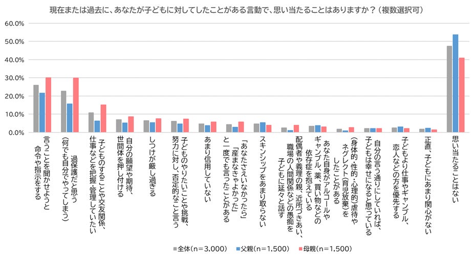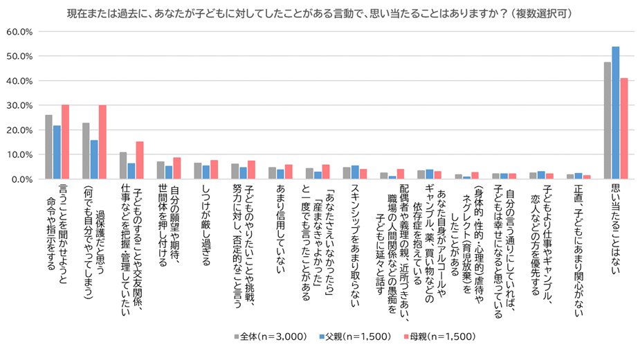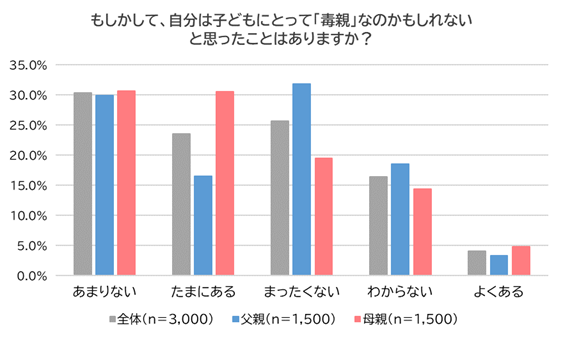 次に、「もしかして、自分は子どもにとって『毒親』なのかもしれないと思ったことはあるか」尋ねました。約3割が「あまりない」(全体:30.3%、父親:29.9%、母親:30.7%)と回答したものの、母親では「たまにある」(全体:23.5%、父親:16.5%、母親:30.5%)、父親では「まったくない」(全体:25.7%、父親:31.8%、母親:19.5%)も多く見られ、父親と母親で差があることが判明しました。また、「よくある」(全体:4.0%、父親:3.3%、母親:4.8%)も僅かながらいました。