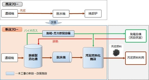 現在、兵庫東流域下水汚泥広域処理場では下水汚泥を全量焼却処理していますが、施設の老朽化が進んでいます。兵庫県では下水道資源の有効利用を推進しており、本工事では、既存設備の改築に加え、国内最大級の汚泥消化施設及び汚泥燃料化施設を新設します。官民連携により、下水汚泥からのバイオガス・汚泥燃料の製造、それらの利活用に取り組み、兵庫県内での下水汚泥エネルギーの有効利用と温室効果ガス排出量削減を推進します。