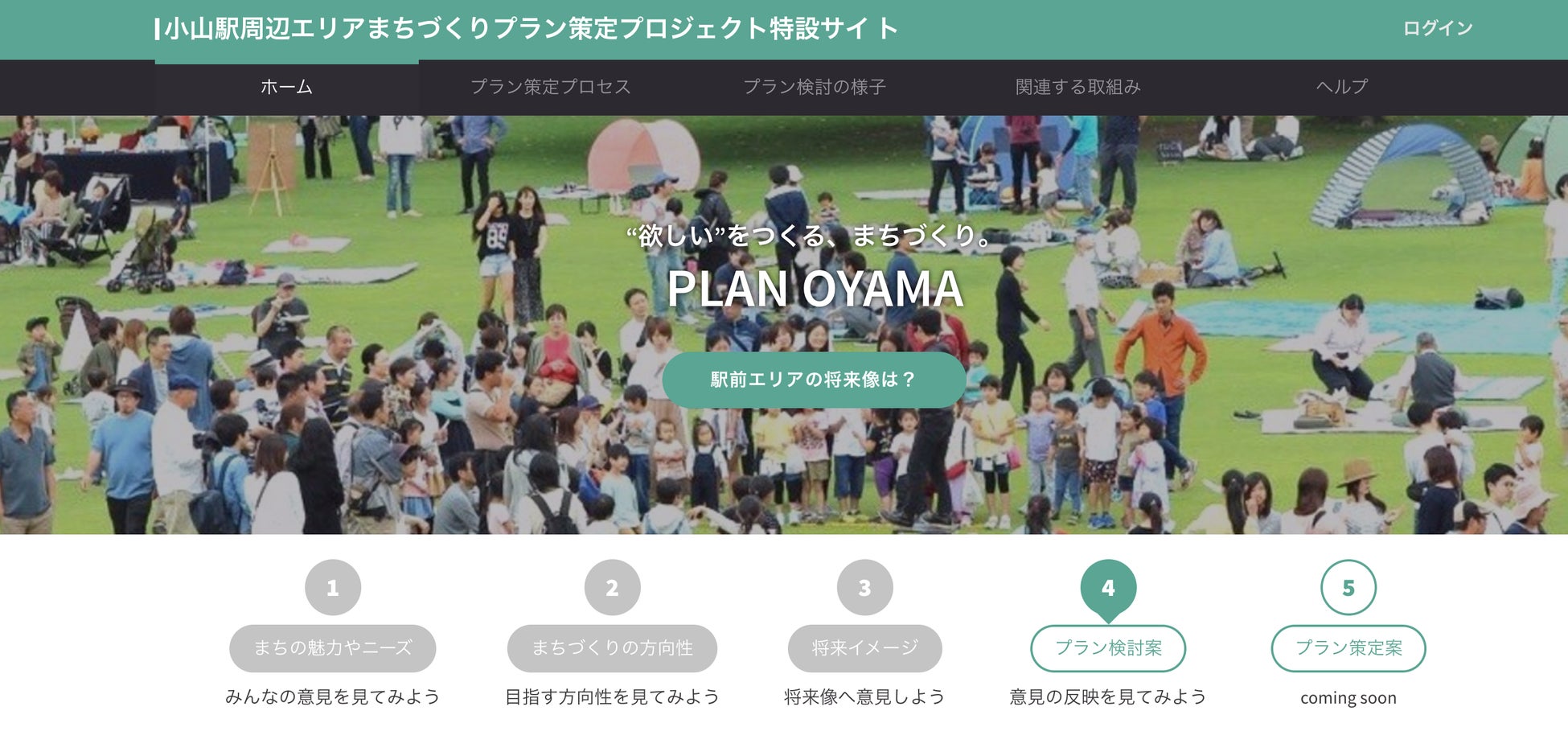 my grooveを活用した「小山駅周辺エリアまちづくりプラン策定プロジェクト特設サイト」(以下「特設サイト」)は、駅周辺地域のまちづくり推進にむけ、市民と行政が共創し、対象地域の活性化や賑わい創出に繋がる将来像(ビジョン)を描くことを目的に設置されました。