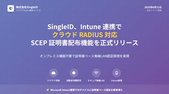 クラウド認証サービス「SingleID」を提供する株式会社SingleID(本社:東京都中央区、代表取締役CEO:石川 貴章、以下SingleID)は、本日、Microsoft Intune と連携したSCEP(Simple Certificate Enrollment Protocol)証明書配布機能を正式リリースしたことを発表いたします。本機能により、Intune管理下のデバイスがユーザー証明書(EAP-TLS)を用いて無線LAN(802.1X)に接続する環境を、オンプレミス機器を一切必要とせずに構築できるようになります。
