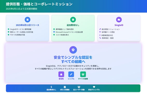 本機能は2025年6月11日より、SingleIDサービスに標準機能として搭載され、追加費用なしでご利用いただけます。なお、Microsoft Intuneライセンスは別途必要となります。