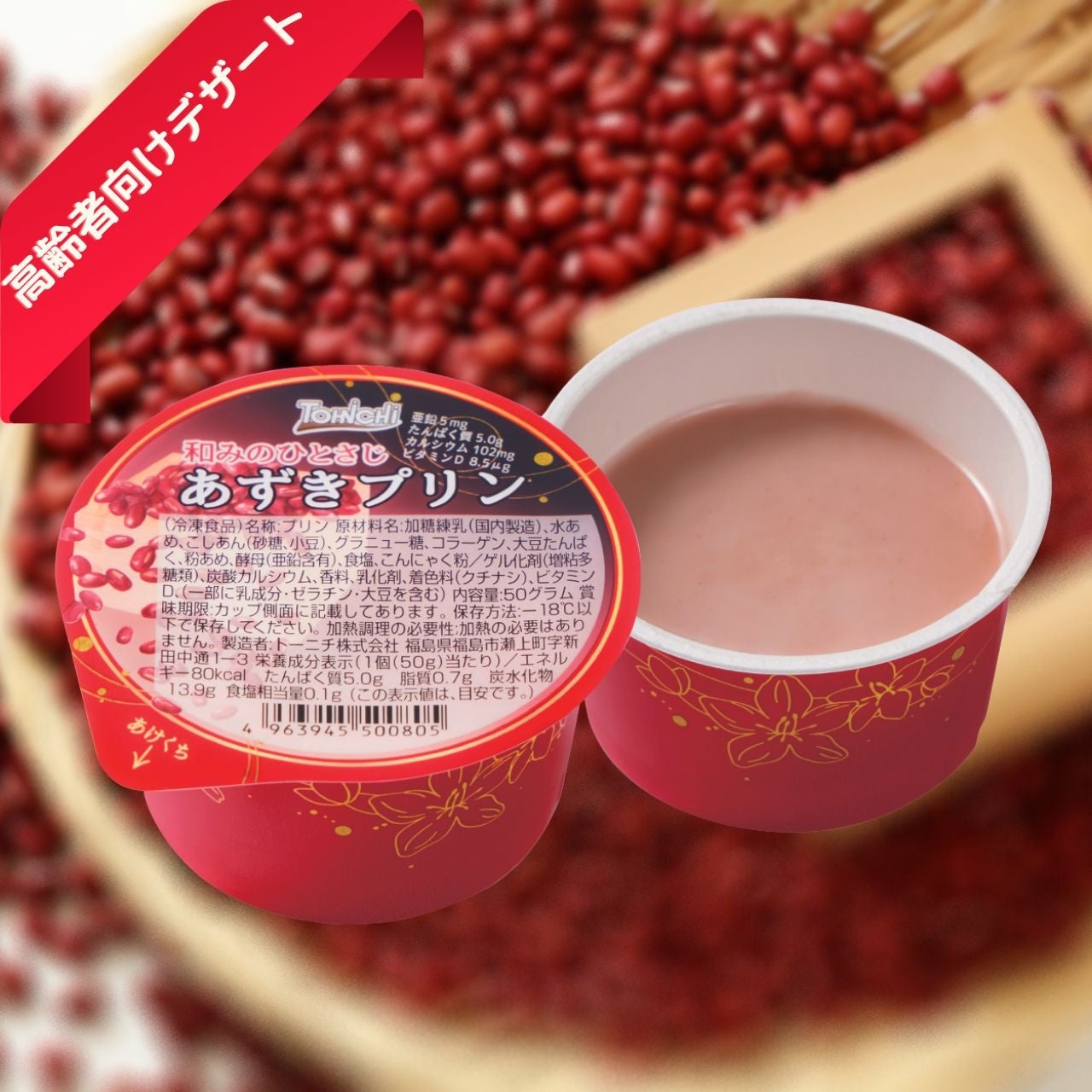 製品1個(50g)で、たんぱく質5g、亜鉛5mg、カルシウム102mg、ビタミンD8.5μgを摂取できる、あずきプリンです。素材の美味しさをいかしたデザートです。