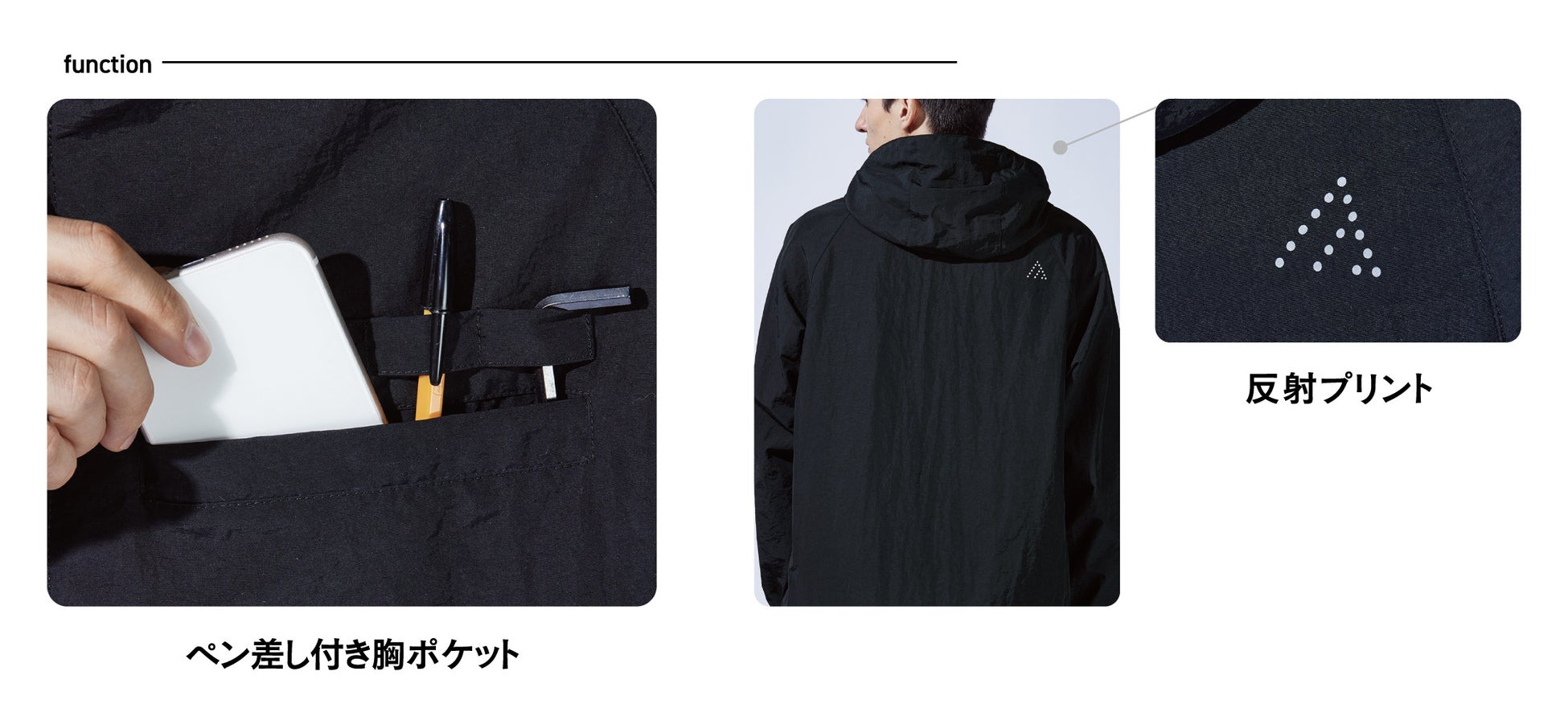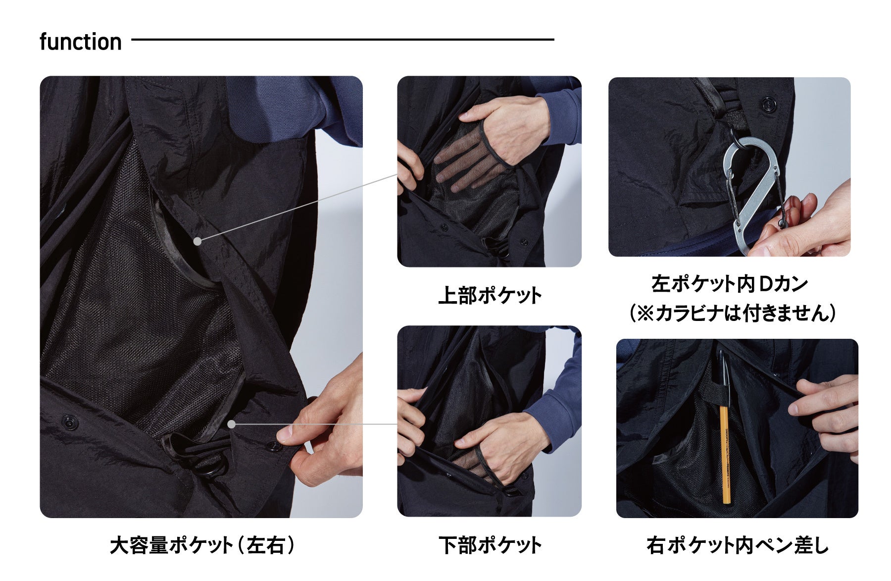 また、バックポケットを左右に、さらに胸元に内ポケットを付け合計9つのポケットを搭載しています。