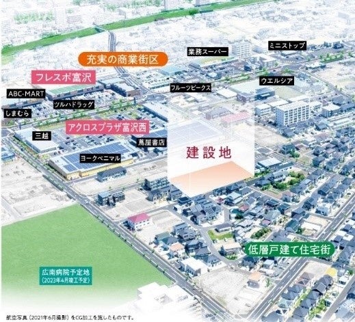本物件は、仙台市太白区の地下鉄「富沢」駅西側の新しい街「富沢ウェストタウン」に誕生、北側には多くの商業施設が集まり、南側には低層の一戸建住宅街が広がる住環境となっています。