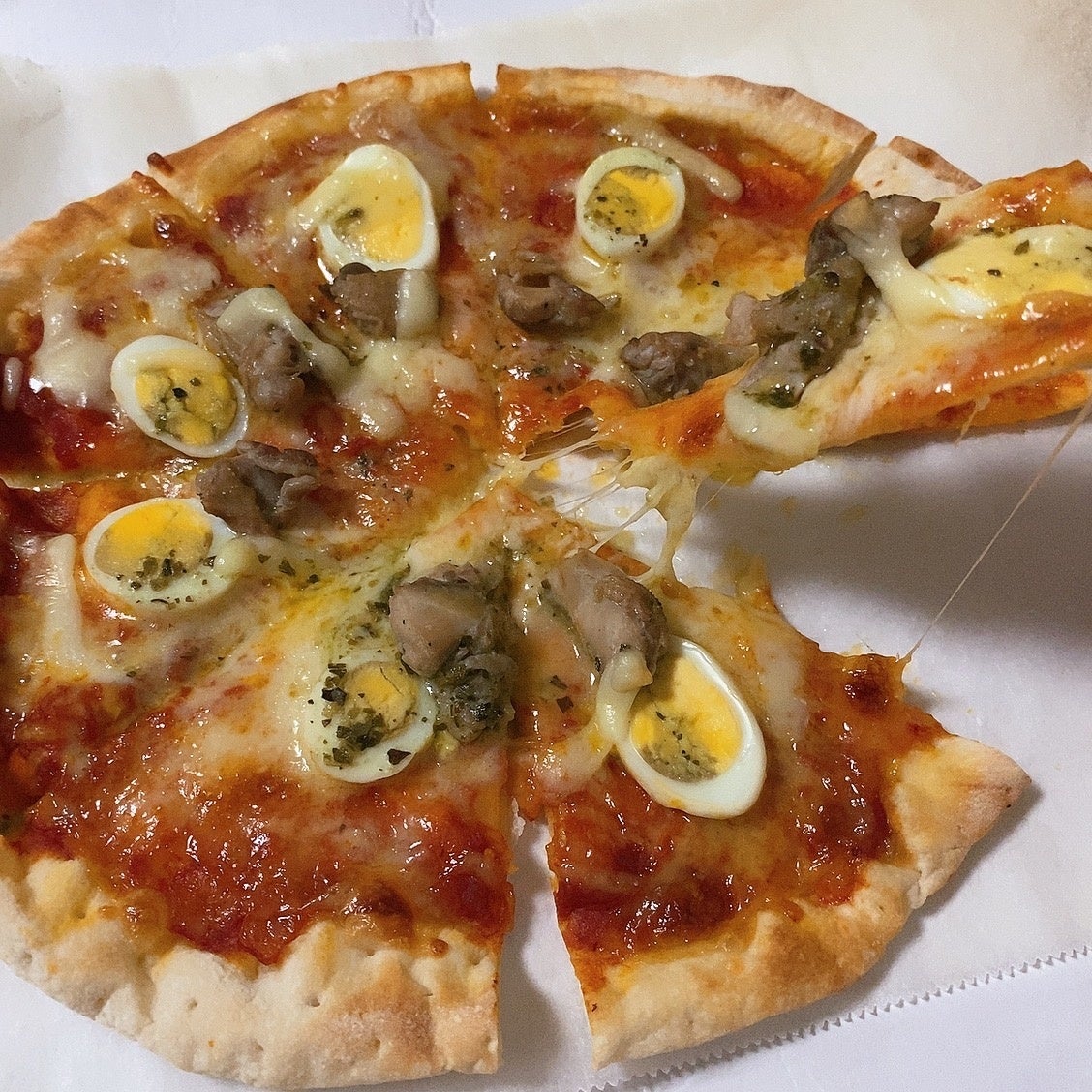 うずらの卵とお肉がトッピングされたマルゲリータ。なかなか味わうことのできないうずらのお肉を是非!!