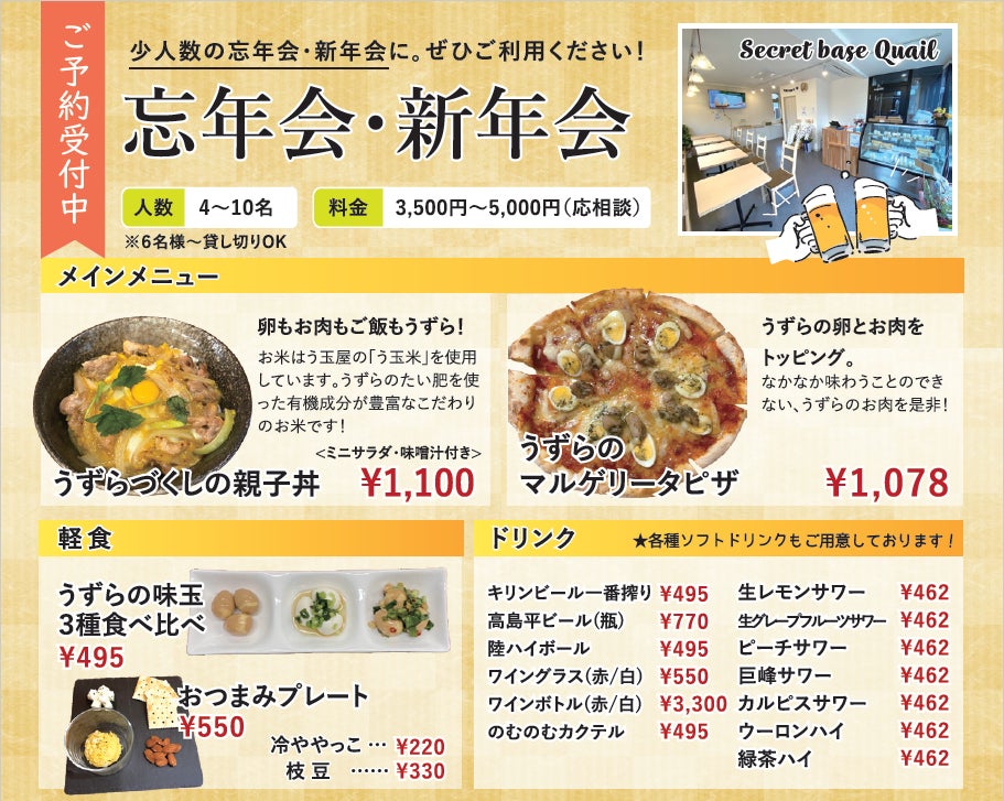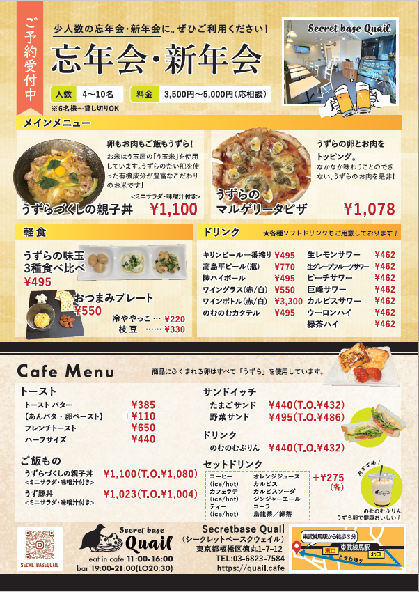 カフェ&バー『Secretbase Quail』にて皆様のご来店、お待ちしております。