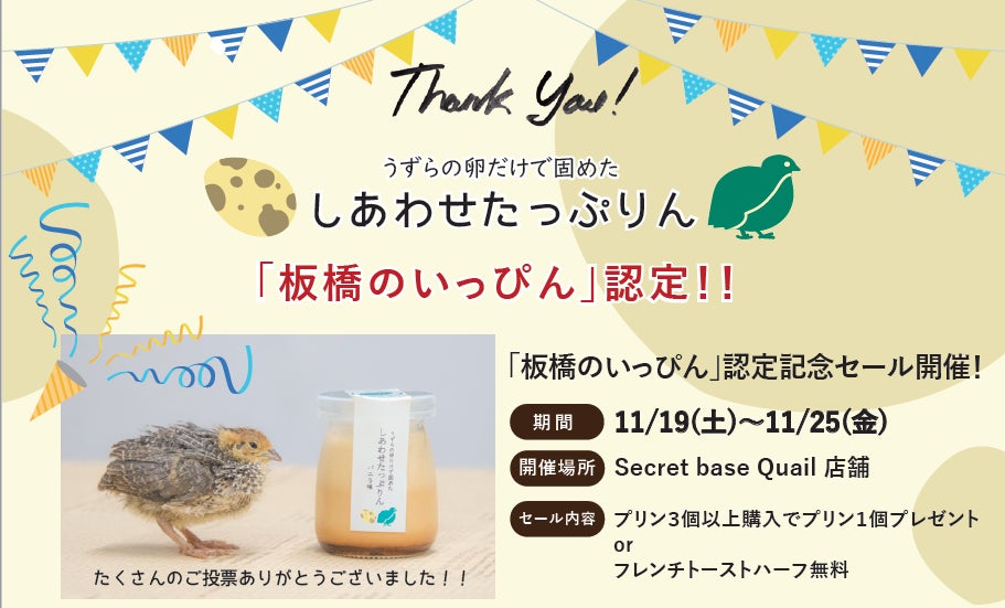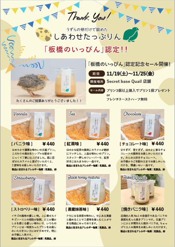 今回、弊社が運営するカフェ&バー”Secret base Quail”の人気No.1商品「しあわせたっぷりん 【バニラ味】」が新たな”板橋のいっぴん”として認定されました。私たちの目標の1つである、「板橋区に新たな特産物をつくる」に向けて、一歩前進することが出来ました。