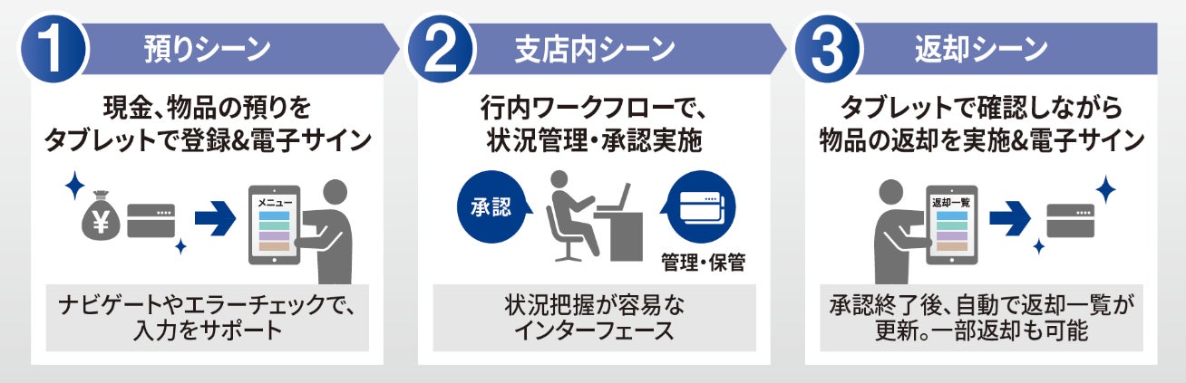 本システムは、金融機関の渉外担当者が顧客から物品・現金等を預り、その後、保管・返却を行うまでの業務を