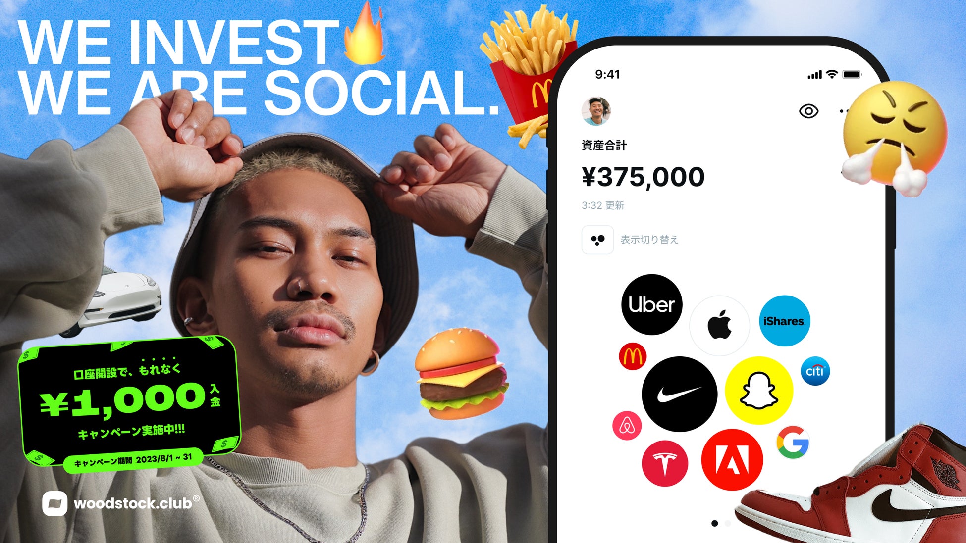 次世代向けSNS型投資アプリwoodstock.club を運営する、「Woodstock(ウッドストック)」(東京都港区、代表取締役 ブライアン ジェフン ユン https://www.woodstock.co )はこの度、期間中の口座開設者全員に1000円入金させていただく、新規口座開設キャンペーンを開始いたしました。入金された1000円で米国株500以上の銘柄を買えるので、すぐに株主になっていただけます。キャンペーン詳細は以下をご確認ください。