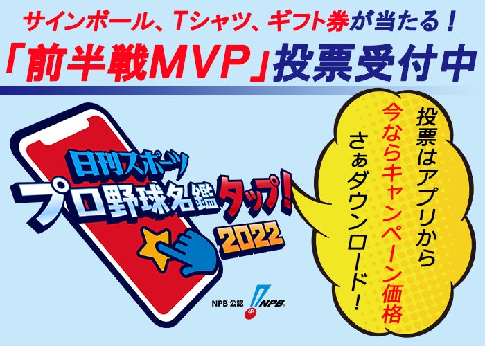 プロ野球観戦サポートアプリ「日刊スポーツ プロ野球名鑑タップ!2022」で「前半戦MVP」を投票すると、抽選で選手グッズやAmazonギフト券が当たるキャンペーンを開催![8月21日23:59まで]