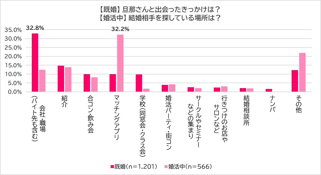 【既婚・未婚女性に調査】結婚相手との出会い方 旦那さんとの出会いは「会社・職場」がトップ 一方、結婚相手は「マッチングアプリ」で探したいと未婚女性