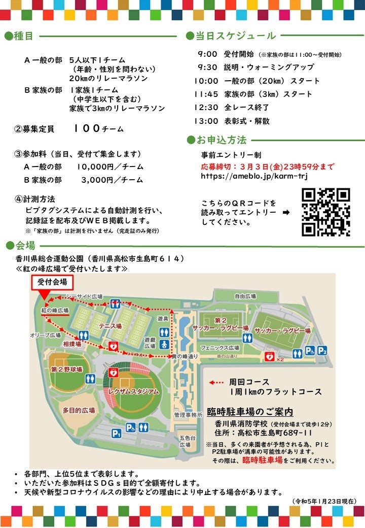 | 申込方法 | インターネットによる事前エントリー(案内チラシ裏面のQRコードを利用) 申込締切:2023年3月3日(金)23時59分まで |