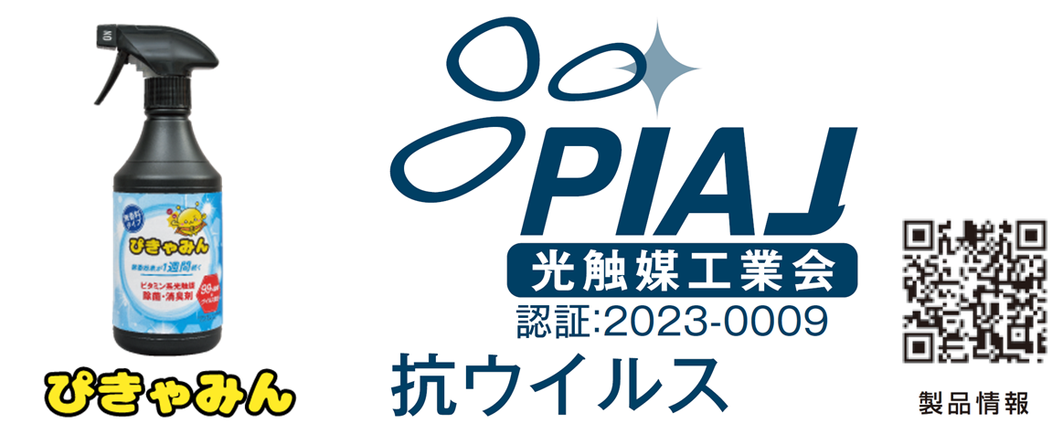 PIAJ製品認証とは、光触媒工業会(PIAJ:Photocatalysis Industry Assoc of Japan)が性能、利用方法等が適切であることを認めた光触媒製品に与える製品認証制度です。PIAJ製品認証(抗ウイルス:可視光)を取得するには、抗ウイルス活性値(JIS R1756)と安全性試験(急性経口毒性、皮膚一次刺激性、変異原性、皮膚感作性)において、光触媒工業会が定める一定の基準を満たすことが必要です。ユシロ化学の「ぴきゃみん」は、光触媒工業会の定める「抗ウイルス:可視光」の性能判定基準と安全性評価基準を満たし、PIAJ製品認証を取得しました。
