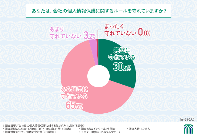 個人情報保護のルールを完璧に守れている方は30.5%、ある程度守れているは65.5%、あまり守れていないが3.2%という結果となりました。