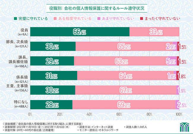 役職別で個人情報保護に関するルール遵守状況を集計したところ下記のような結果となりました。