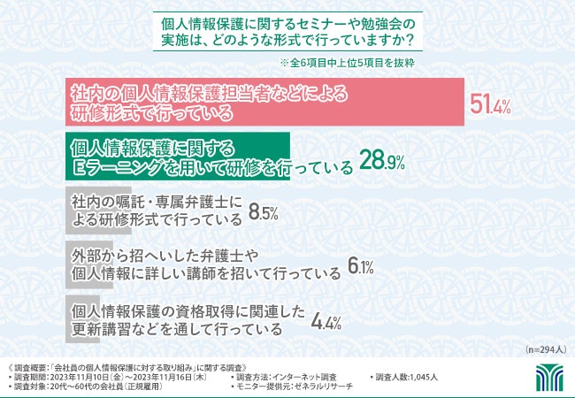個人情報保護に関するセミナー、勉強会が、3割近くの企業で実施されているが、内部講師やeラーニングによるものがほとんどで、外部弁護士や専門講師を招いたり、資格取得に関連した講習などの外部の目やシビアな意見を取り込む研修は10.5%と少ない。