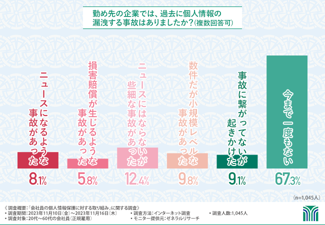 過去に個人情報の漏洩事故が起きた企業は約30%以上!漏洩事故が無い企業は67%!