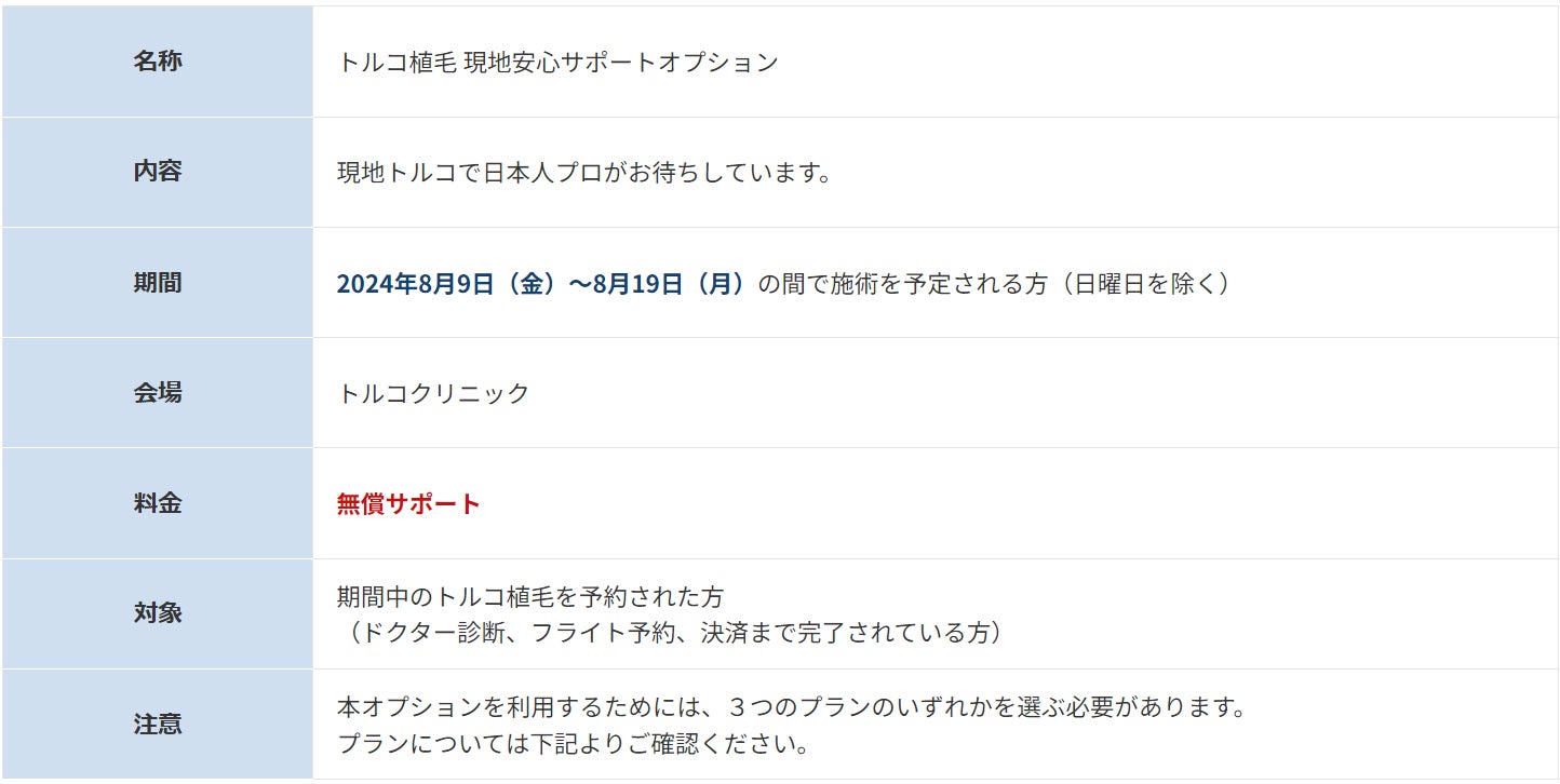 トルコ植毛 現地安心サポートオプションは、現地で日本人プロを備え、海外での植毛に不安を抱える方のための特別オプションとなります。トルコ現地での提供を予定しており、2024年8月9日~19日の期間限定サービスとなります。