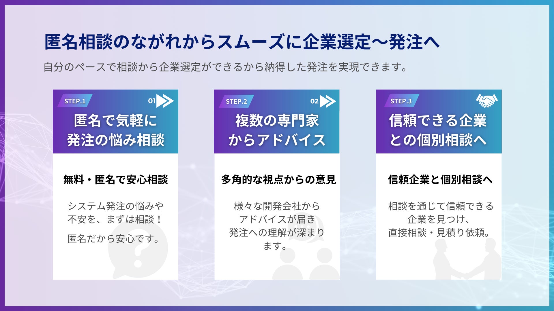 企業名などの個人情報を開示せずに相談できるため、競合他社や取引先に知られる心配はありません。複数の開発会社に個別に問い合わせる手間を省き、情報収集を行いながら信頼できる企業を見極めて次のステップに進めるので、あなたのペースで安心して発注をスタートできます。