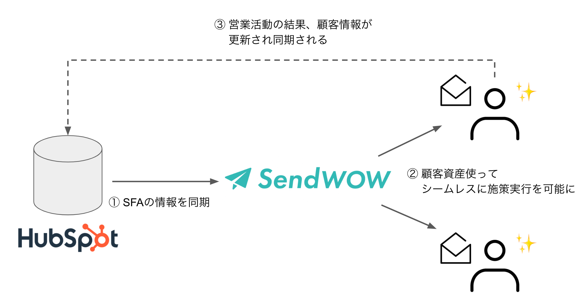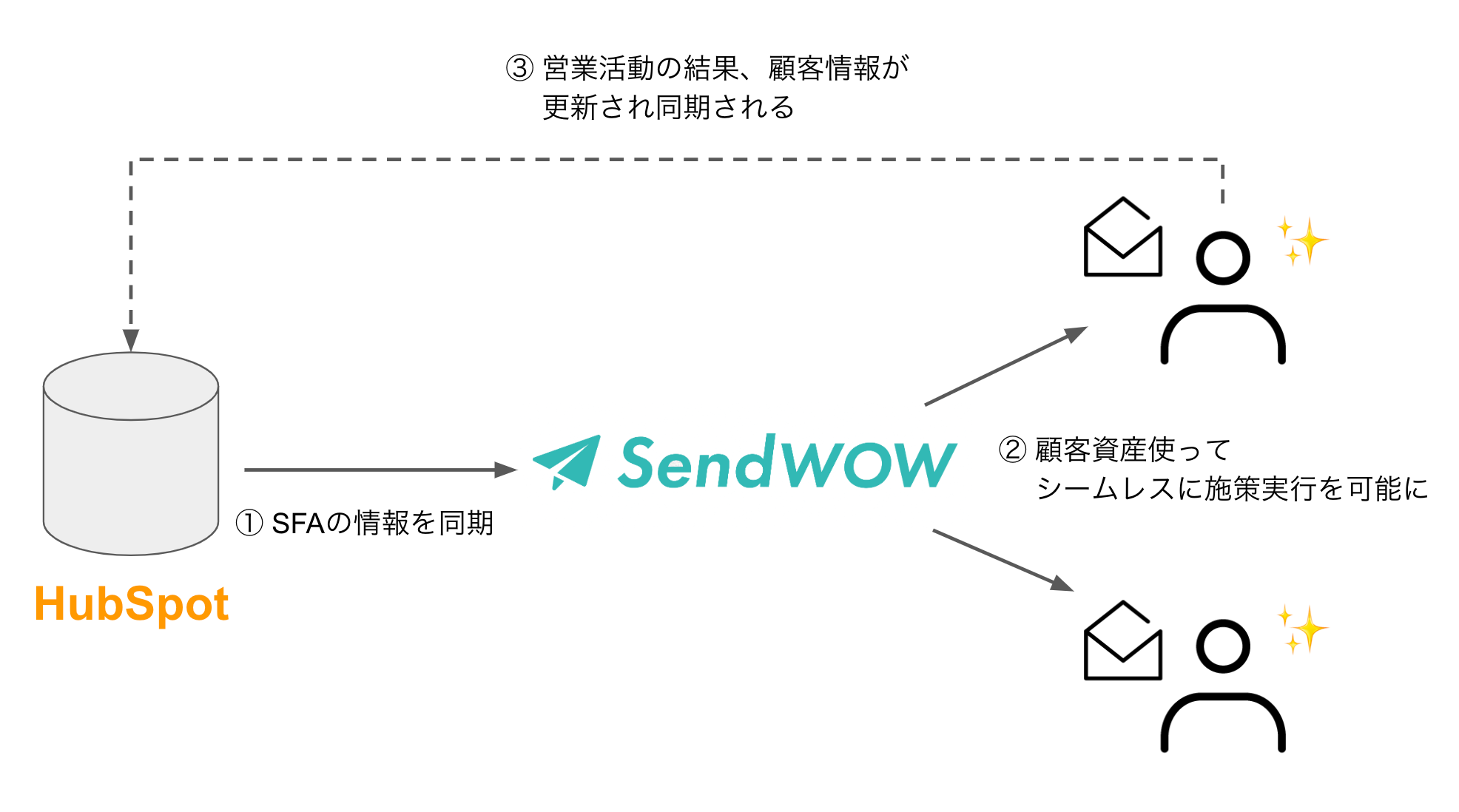 日常的に使っている SFA/CRM 上からシームレスに SendWOW を利用できるため、法人営業やマーケティング担当者の方は業務に負担をかけることなくタイムリーな施策を実行することができ、営業・マーケティング活動の成果に結びつくことが期待されます。