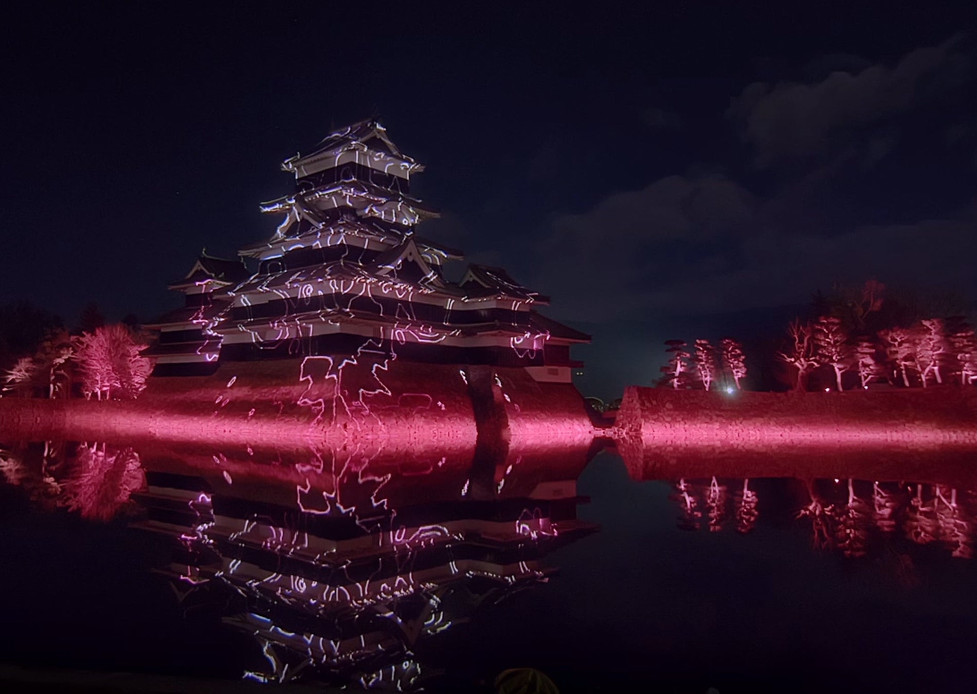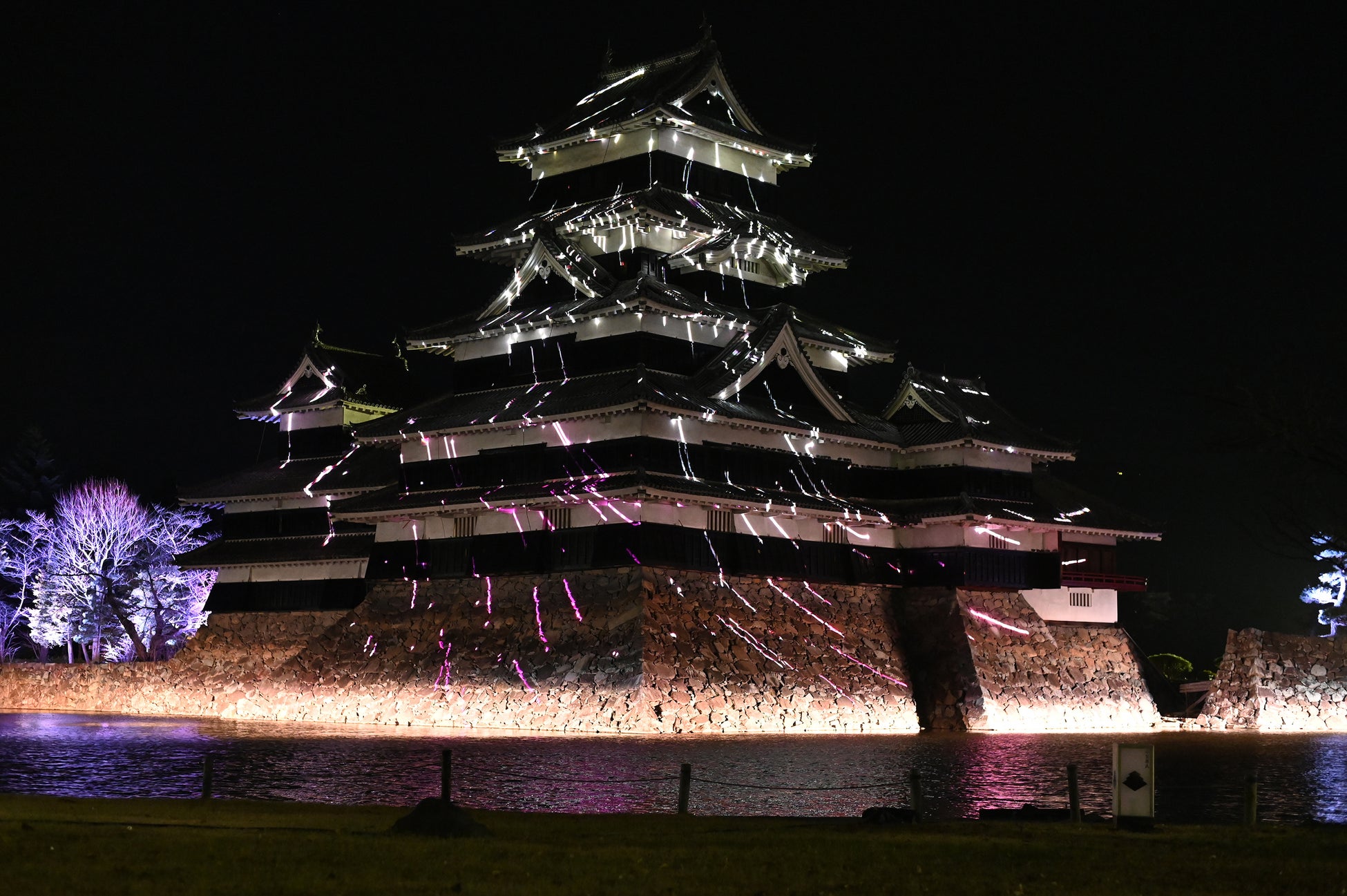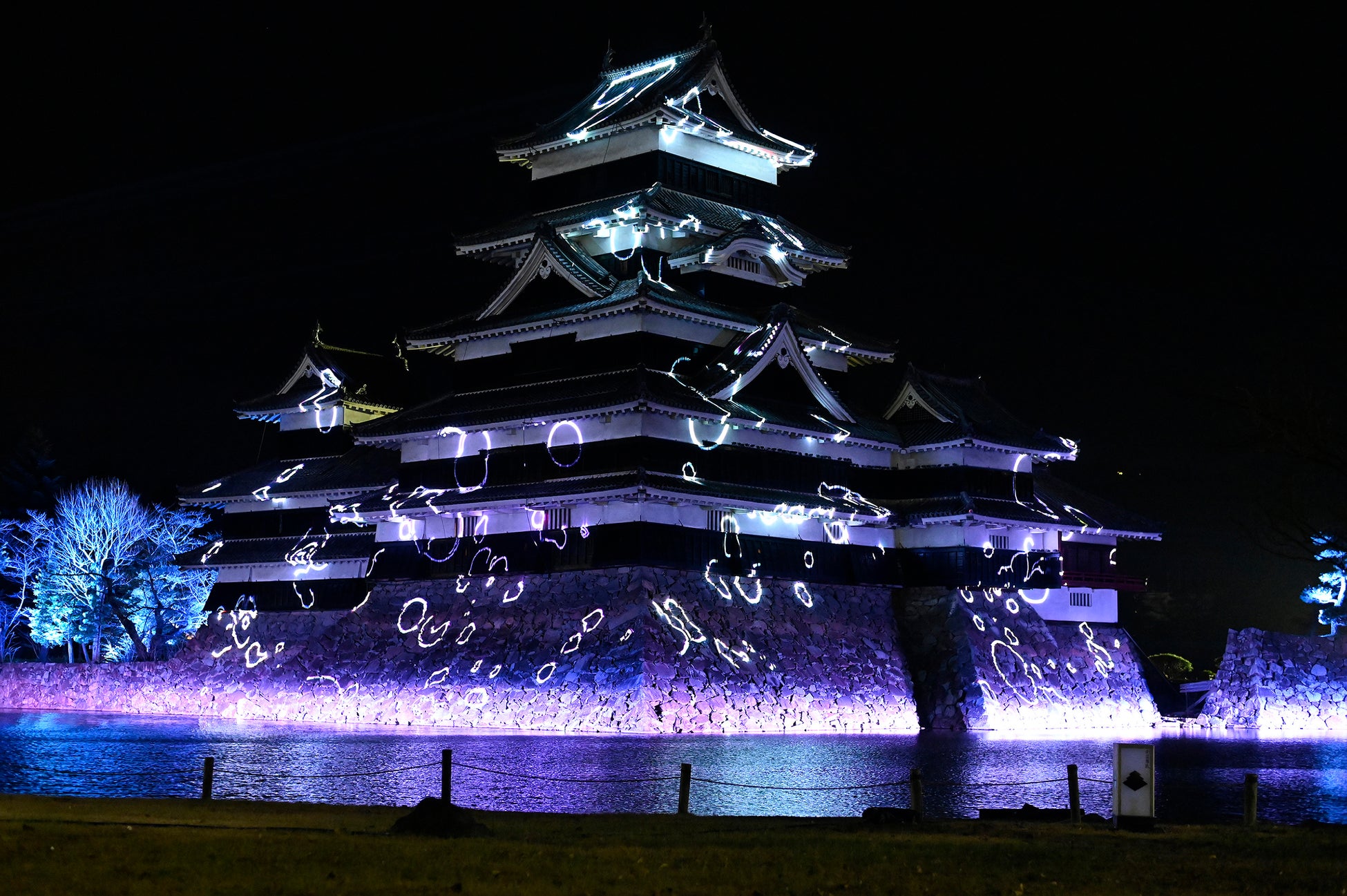 長野県松本市のシンボル「国宝松本城」を舞台にしたレーザーマッピング「松本城〜氷晶きらめく水鏡〜」が実施中