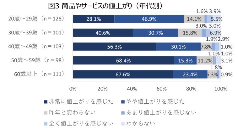 年齢が上がるほど値上がりを感じる割合も高まる傾向に