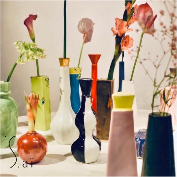 モダンなフォルムにヨーロッパの釉薬で彩られたカラーリング。一輪挿しとして、またアートピースとしても存在感のある、一点物のフラワーベースです。多肉植物に合わせたプラントポットや曲がったフォルムが特徴の鉢。どちらも、そのまま飾れ、インテリアとして楽しめる存在感が特徴です。
