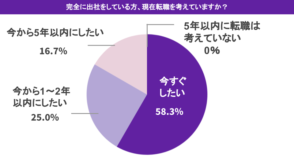 現在、完全に出社をしていると答えた人はすべて5年以内には転職したいと答えました。(58.3%が今すぐしたい、25.0%が1〜2年以内にしたい、5年以内にしたいは16.7%、5年以内に転職は考えていないは0%)