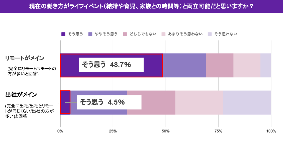 完全にリモートと答えた人のうち48.7%が、 現在の働き方がライフイベント(結婚や育児、家族との時間等)と両立可能だと考えている また、完全に出社・出社とリモートが同じくらい出社の方が多いと答えた人の4.5.%がライフイベントと両立可能と考えているため、その差は10倍以上となっています。