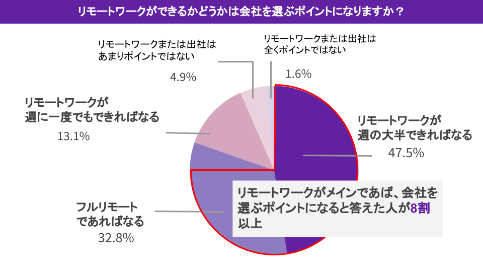 こうした背景のもと、実施した本調査では、完全に出社している人のすべての回答者が5年以内には転職したいと回答し、週の大半以上リモートワークができるかどうかが会社を選ぶ際の決めてになる等、コロナ禍を経て出社の価値が持続可能なキャリアにおいて再検討されていることが示唆されています。