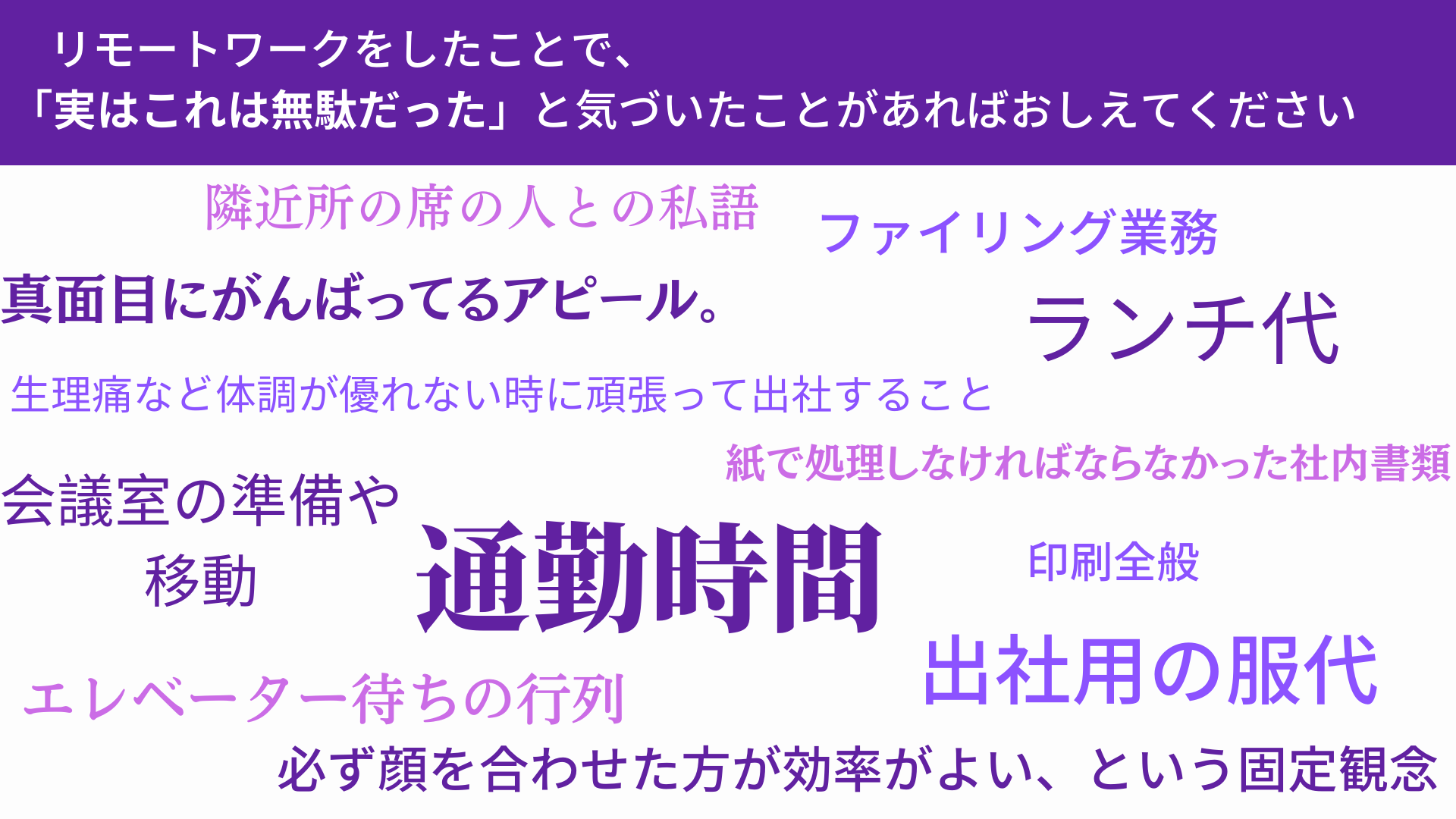 リモートワークをしたことで、「実はこれは無駄だった」と気づいたことがあればおしえてください、という質問に対し50件以上の多様な回答が寄せられました。