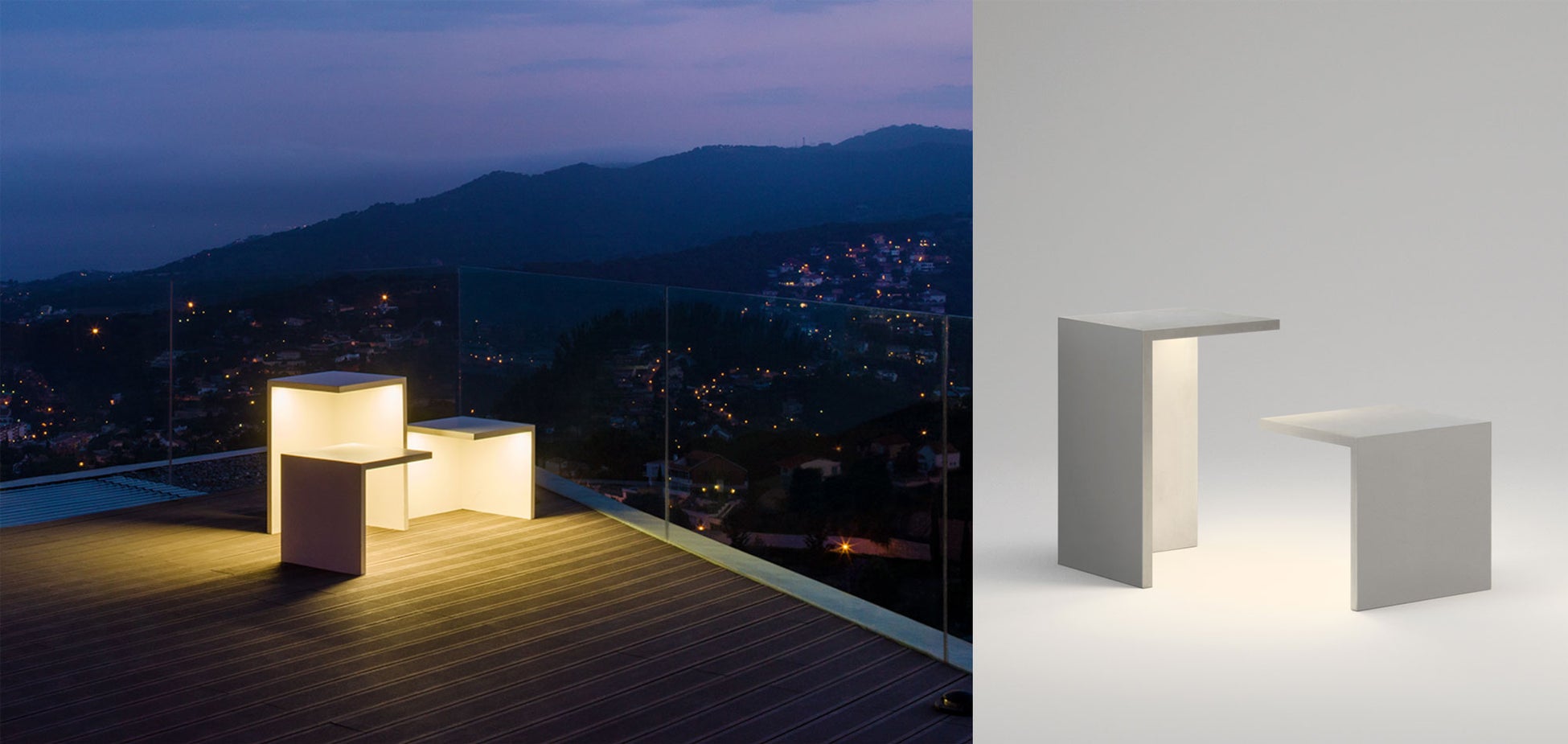 昼は彫刻、夜は照明。繊細な造形の照明でありながら、サイドテーブル或いはスツールとしても機能します。足元にはあたたかみのある光を放ちます。