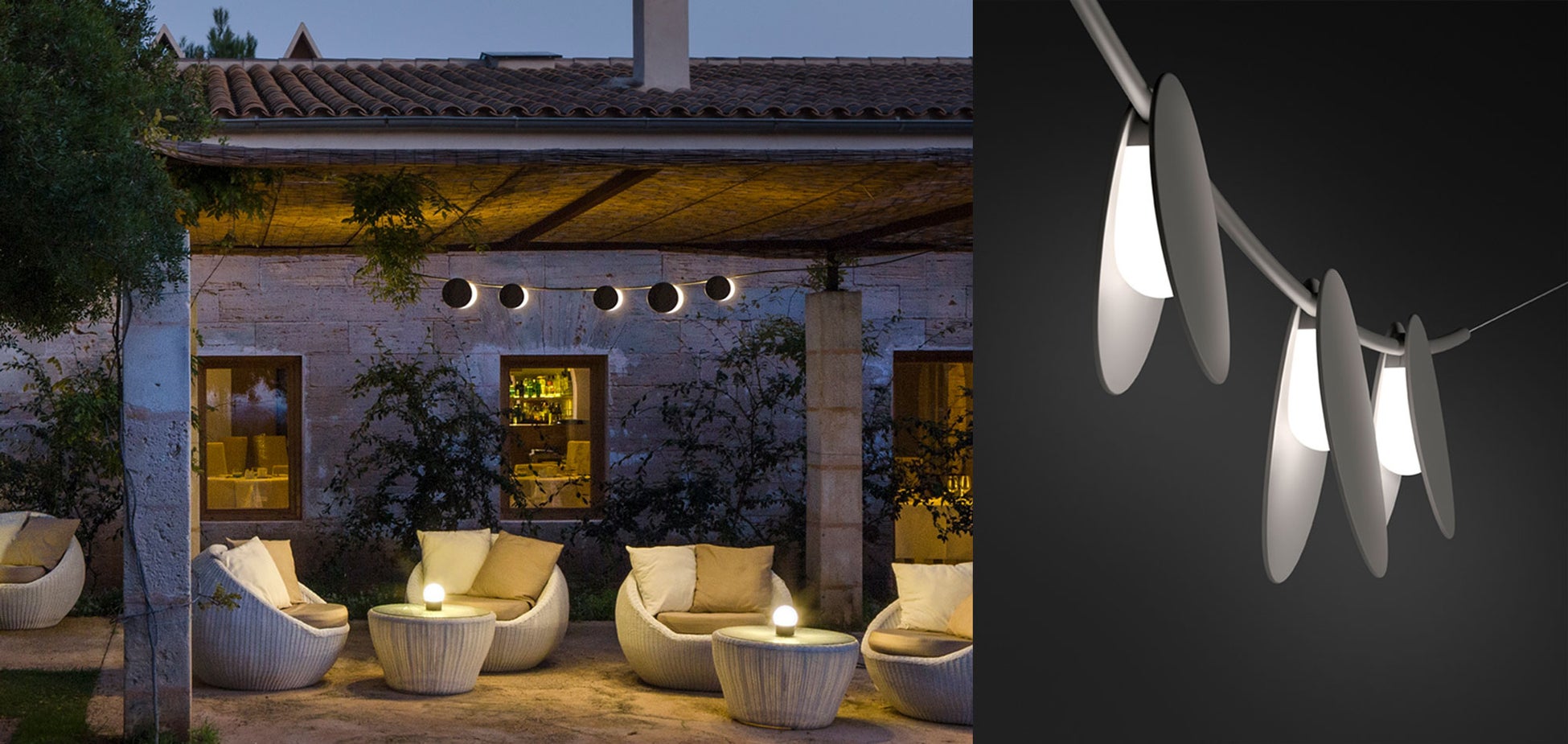 伝統的なランタンをイメージしたJuneは、屋外に飾られたガーランドのよう。月の満ち欠けを思わせる灯具から滲み出す光が、中庭やパティオをやさしく包み込みます。