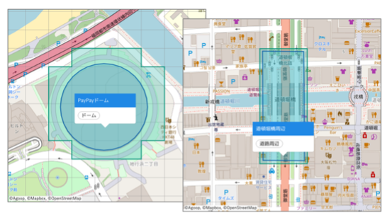 ・分析したい店舗やエリアを自由に設定可能エリア設定画面で、分析したい店舗や施設などがあるエリアを、お客さま自身で自由に指定することが可能です。設定したエリアの分析結果は、ブラウザー上でスピーディーに確認することができます。