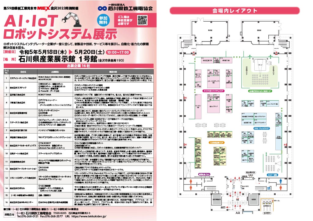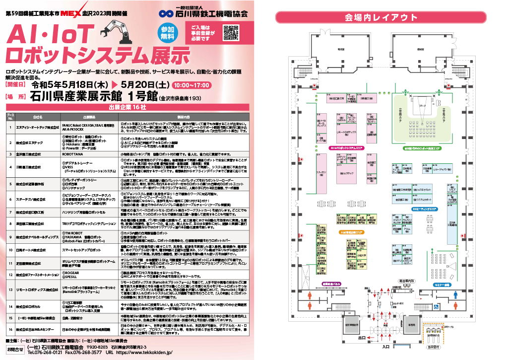すべての人々が社会参加できるリモート社会の実現を目指すリモートロボティクス株式会社(東京都港区、代表取締役社長:田中宏和、以下「リモートロボティクス」)は、2023年5月18日(木)~20日(土)の3日間、石川県産業展示館にて開催されるMEX金沢2023併催イベント「てっこうきでんDXミーティング AI・IoTロボットシステム展」に出展します。