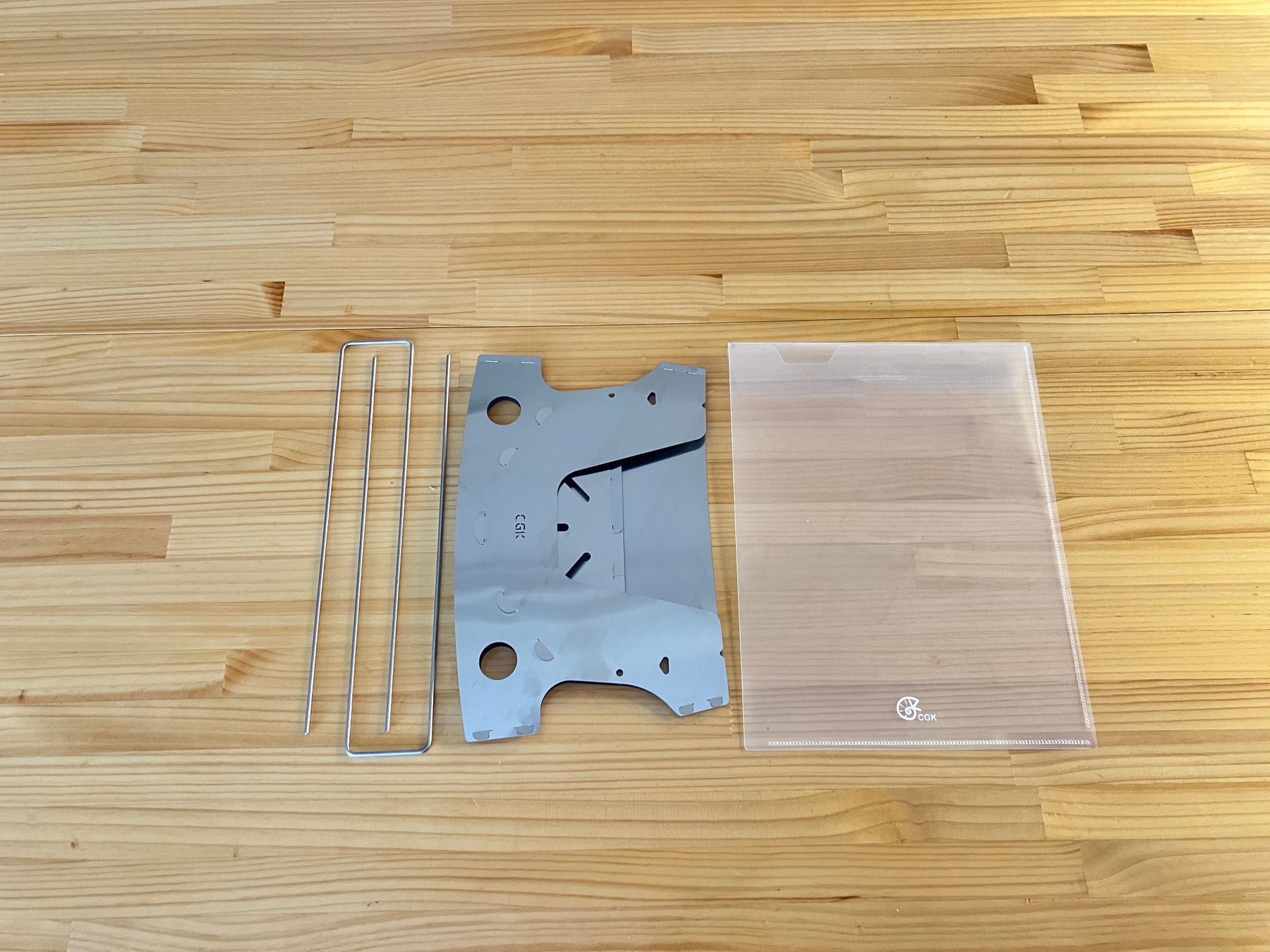 ペラペラなステンレスのみで構成される本体重量は134g、付属のスピットは40g/1本×2とケースを含めても244gと軽量な焚き火台を実現しました。風が強いと軽すぎて飛んでしまう可能性があるほど軽量になっています。本体サイズはA4サイズで、ケースに収納した状態での厚みは4mm程度。クリアファイルに入れた資料の感覚で本棚等にも収納できます。