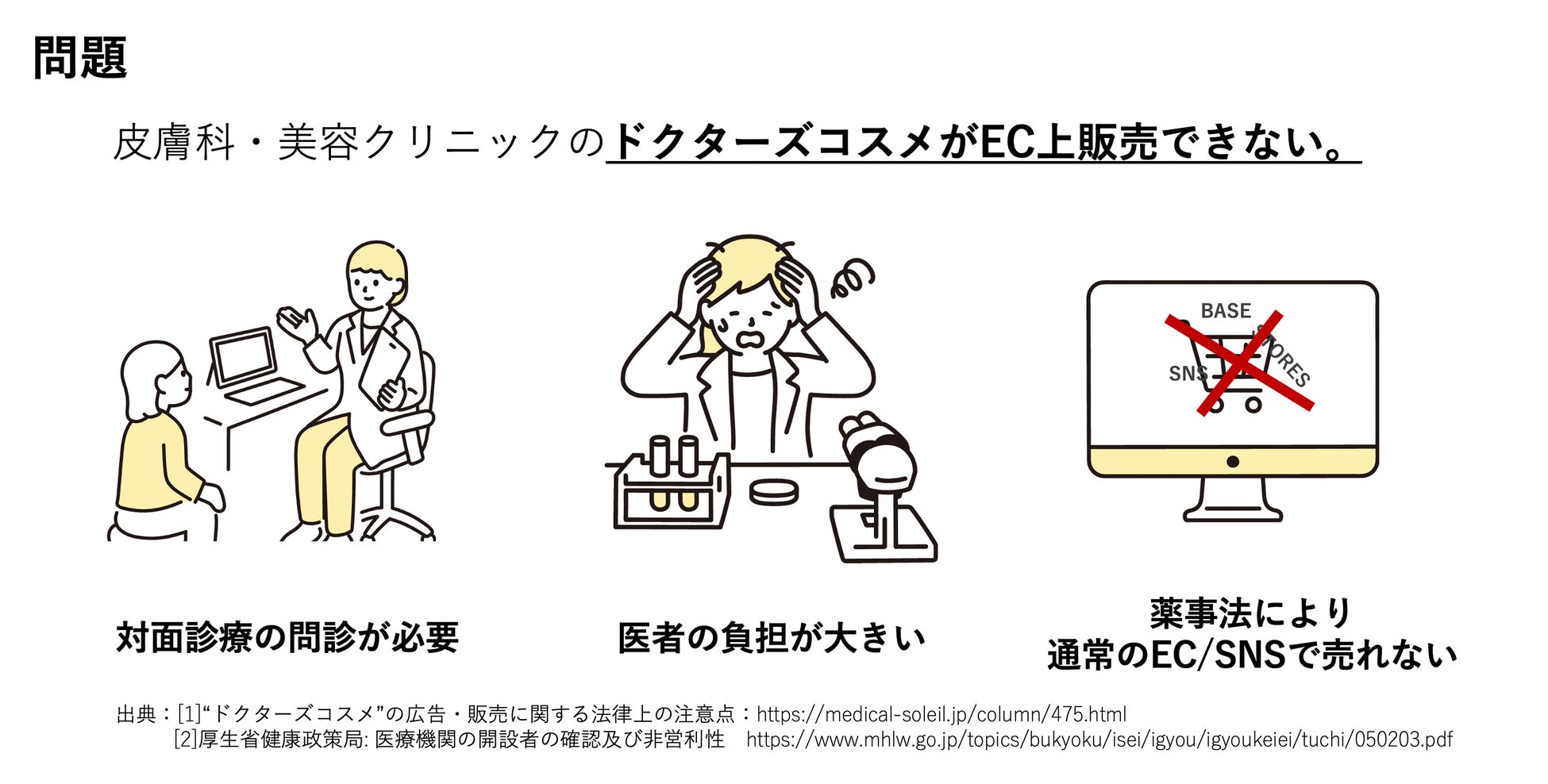 皮膚科・美容クリニックでは、多くがドクターズコスメを開発、販売していますが、それらを一般的なEC上では販売できないという悩みを抱えています。ドクターズコスメの販売には対面診療の問診が必要で、そのため、医師の時間的な負担が大きいという現状があります。また、薬事法によって、一般的なEC/SNS上では販売できないという規制があります。