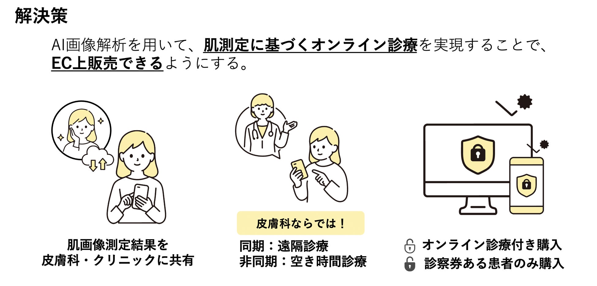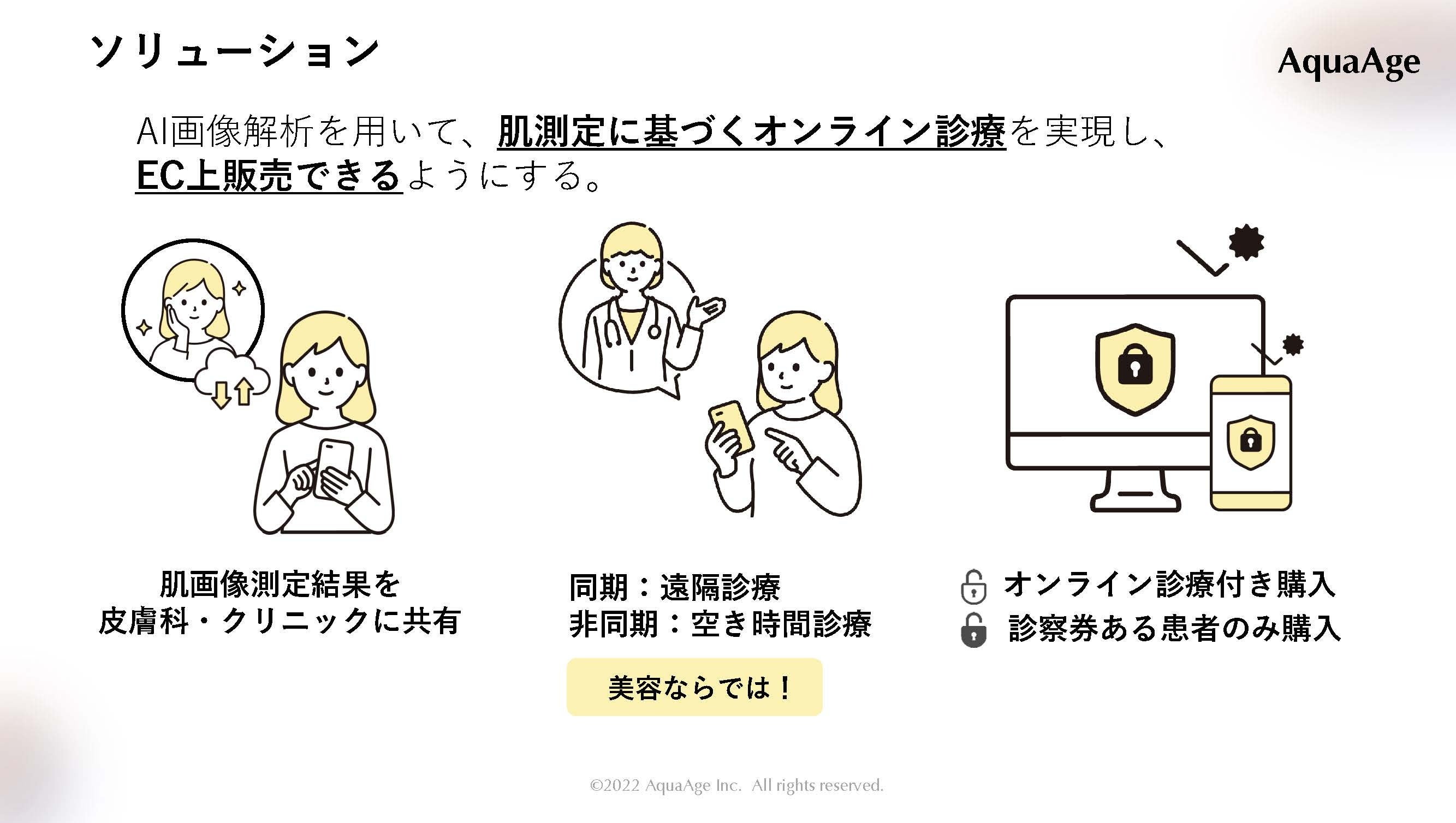 これらに対し、AquaAgeが提案するソリューションは、AI画像解析を用いて、肌測定に基づくオンライン診療を実現し、ドクターズコスメのEC販売を可能にします。具体的には3つのステップによって実現されます。