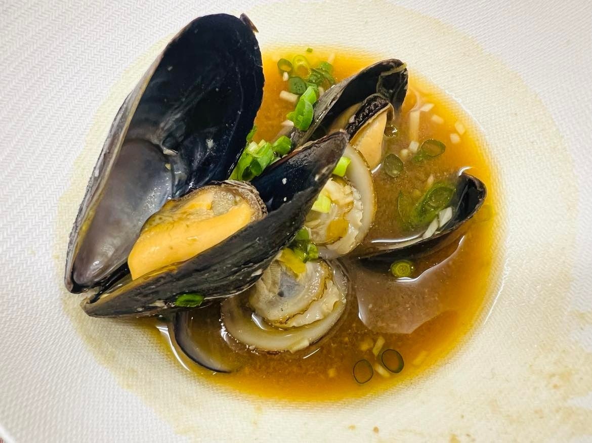 Hirosawa created 2 recipes, each including familiar ingredients from both countries. The first one was made with mushroom and fried tofu, leek and Japanese green onion. The second one was a shellfish collaboration, made with Zeeland Dutch mussels and shijimi, Japanese freshwater clam. The dashi soup stock was made from dried cod and kelp.