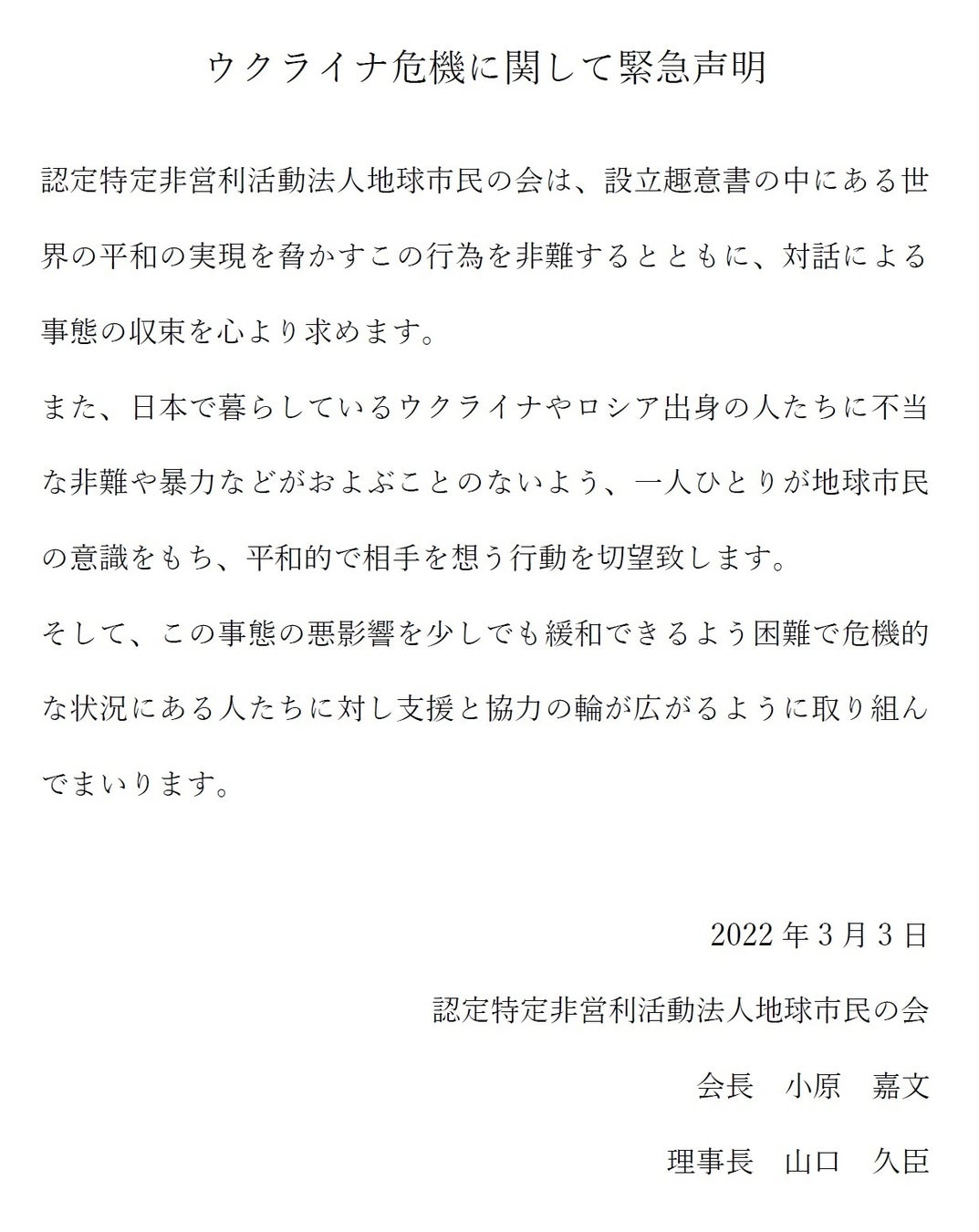 特定非営利活動法人地球市民の会(佐賀市、理事長:山口久臣)は、ウクライナ危機に関する緊急声明を発表します。