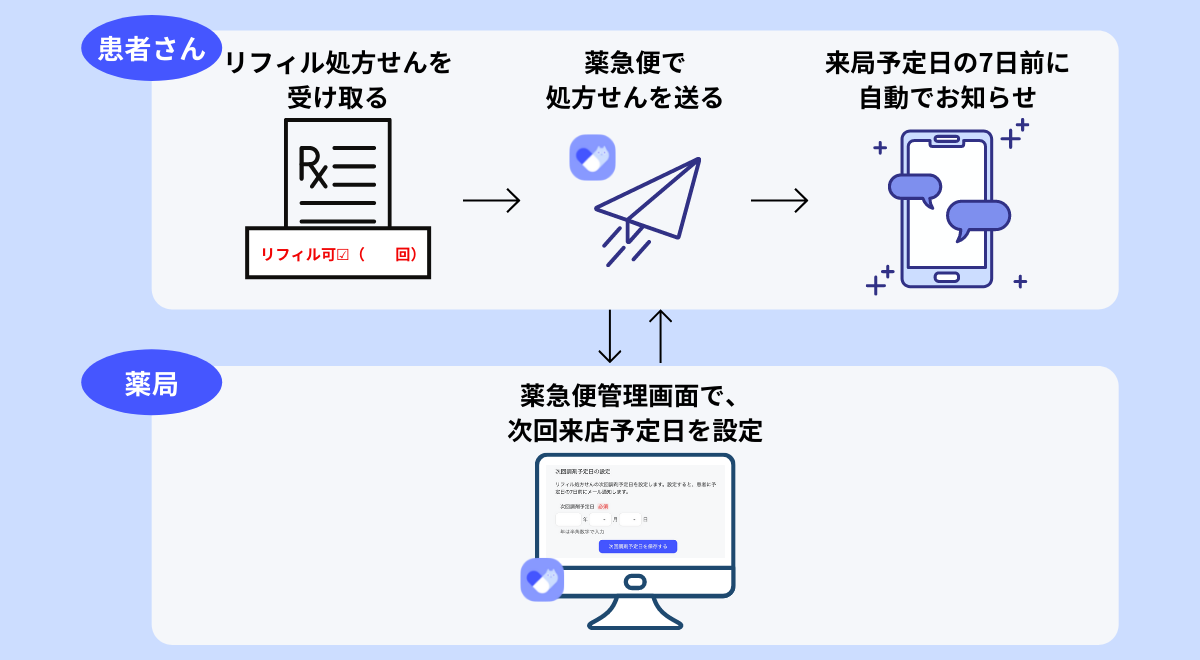 2022年4月の診療報酬改定にて、リフィル処方せんの運用が正式に開始されました。今回の制度改定を受け、薬急便で薬局にリフィル処方せんを送った患者さんに対し、次回来局予定日の7日前に自動で再来店を促すメッセージを配信できる機能を追加いたしました。