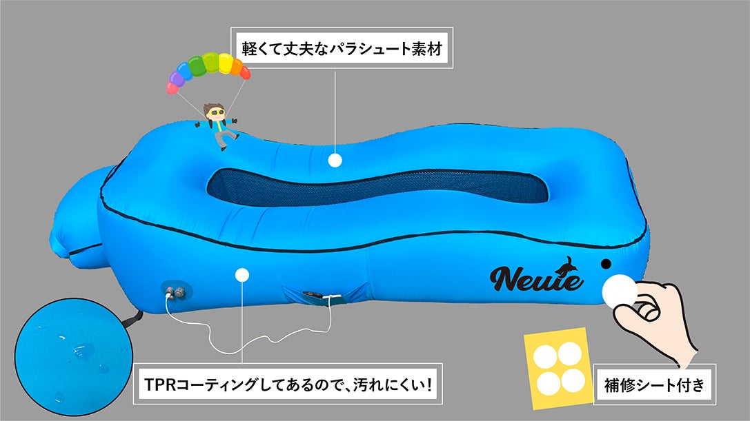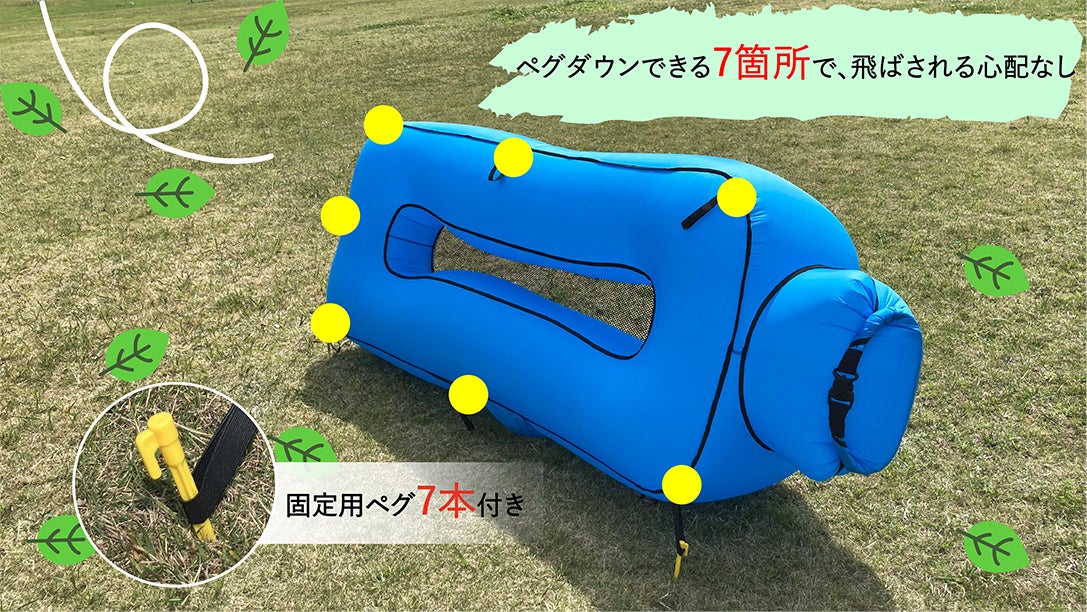 そしてこの度、新たに発売するアウトドア用品『ワンタッチ・エアソファー』は、ボタン一つで簡単に完成する簡易ソファーです。素材には軽くて丈夫なパラシュートナイロンを使用しており、重さはわずか1.2㎏。TPRコーティング加工も施しているため、水や汚れにも強く耐久性に優れています(※)。本体中央部分にはメッシュ生地を採用しているので通気性も良好。キャンプや公園、海・川などアウトドアシーンはもちろん、サウナ後の整い時間や自宅やオフィスのリラックスタイムなどさまざまなシーンでご利用いただけます。